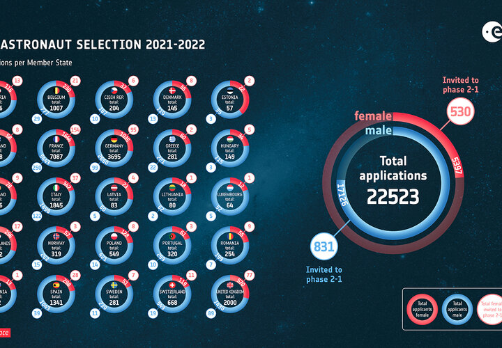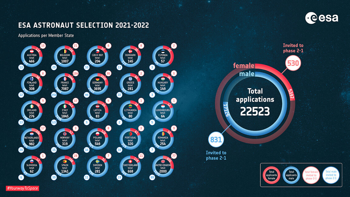 Insgesamt 22'523 Astronauten-Bewerbungen hat die ESA auf ihre Ausschreibung im ersten Halbjahr 2021 erhalten. Mit 7087 Bewerbungen gingen aus Frankreich am meisten Dossiers ein, gefolgt von Deutschland mit 3695 und dem Vereinigten Königreich mit 2000. Aus der Schweiz haben sich 119 Frauen und 549 Männer beworben.