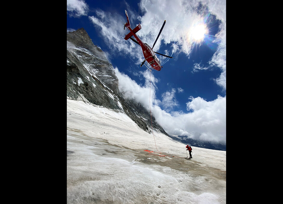 Schliesslich wurde ein 100 Meter langes Seil am Helikopter mit einem 50 Kilogramm schweren Sack stabilisiert und zu den erschöpften Berggängern geflogen. Zusammen mit dem Rettungsspezialisten konnte die Crew der Air Zermatt die vier Bergsteiger am Matterhorn erfolgreich retten. Sie waren erschöpft, aber unverletzt.