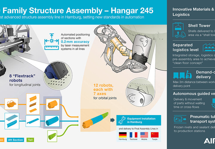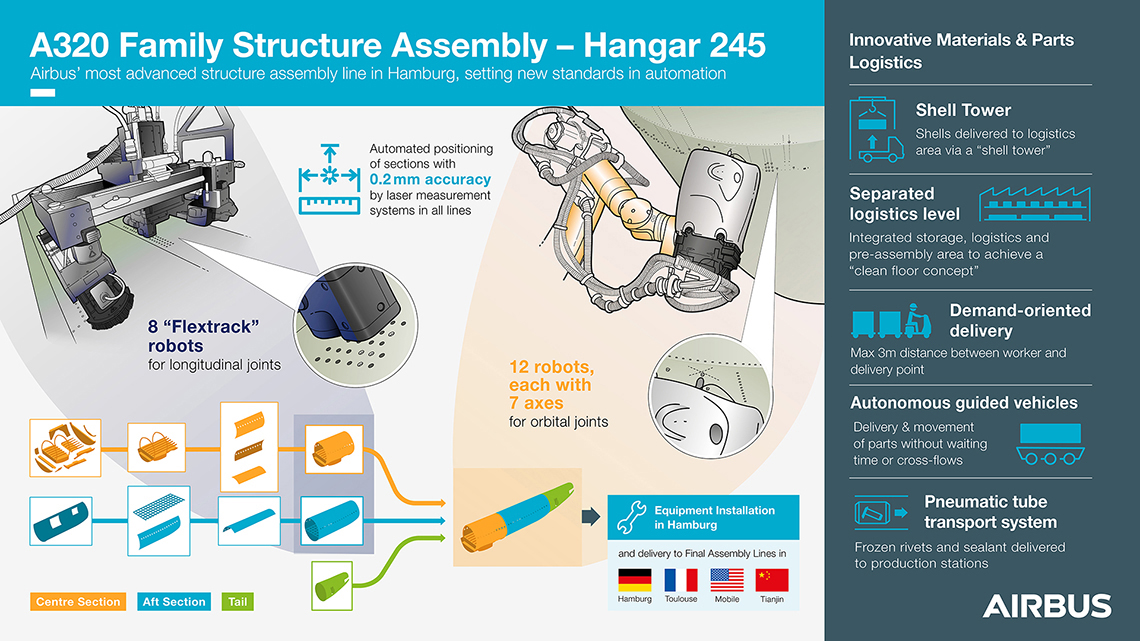Für die anfängliche Sektionsmontage verwendet Airbus das modulare und leichte «Flex-Track»-System, bei dem acht Roboter 1'100 bis 2'400 Löcher pro Längsverbindung bohren und senken. Im nächsten Produktionsschritt setzen zwölf Roboter mit je sieben Achsen Rumpfmittel- und Hecksektion mit dem Leitwerk zu einer der Hauptkomponenten zusammen, wobei sie 3'000 Nieten pro Quernaht bohren, senken, abdichten und einsetzen. Neben dem Einsatz von Robotern implementiert Airbus neue Methoden und Technologien für Material- und Ersatzteillogistik zur Verbesserung von Produktion und Ergonomie sowie zur Verkürzung der Durchlaufzeiten. Dies beinhaltet die räumliche Trennung der Logistik- und Fertigungsebenen, einen bedarfsorientierten Materialfluss sowie den Einsatz fahrerloser Transportsysteme.