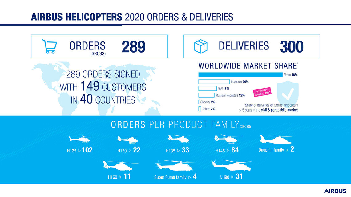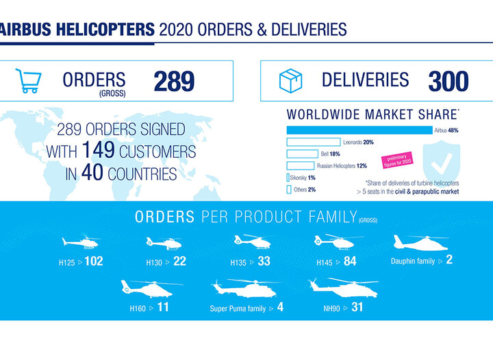Als Auftragshöhepunkte für 2020 bezeichnet Airbus die 84 Hubschrauber für den Bestseller H145, darunter 17 UH-72B für die US-Armee, die als erste Versionen mit Fenestron- und Helionix-Ausrüstung bestellt werden. Der H135 erzielte mit 33 Einheiten einen soliden Absatz und erhielt Ende 2020 auch die EASA-Zertifizierung für ein alternatives Bruttogewicht sowie ein neues IFR-Cockpit-Layout für Einzelpiloten. Milestone Aviation und Heli-Union wurden beide neue Kunden für den Multimissions-H160, der für eine breite Palette von Missionen, einschliesslich Offshore-Transporte, bestellt wurde.