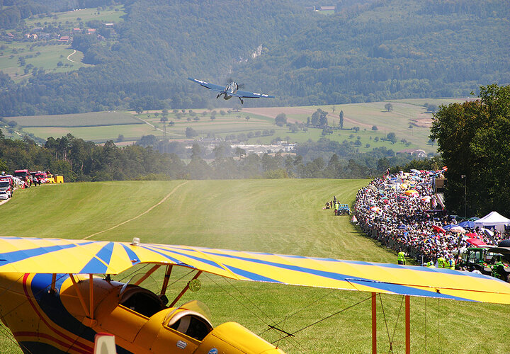 Am Sonntag geht es um 10 Uhr weiter, das Hauptprogramm beginnt um 12.30 Uhr und dauert bis um 17 Uhr. Da vor Ort nur eine beschränkte Anzahl Parkplätze zur Verfügung steht, wird für die Anreise die Benützung der Öffentlichen Verkehrsmittel empfohlen. Ab dem Bahnhof Laufen besteht ein Shuttlebus-Betrieb – oder man wählt einen schönen Wanderweg, der in rund 45 Minuten zum Flugplatz Dittingen führt.