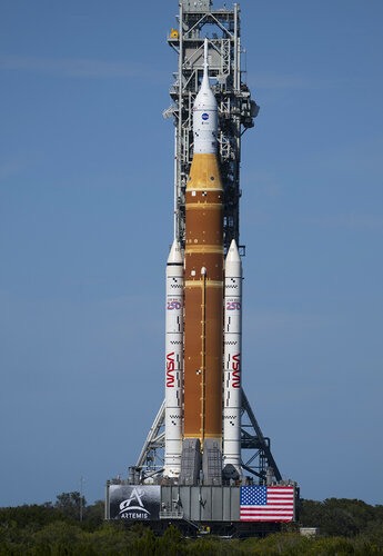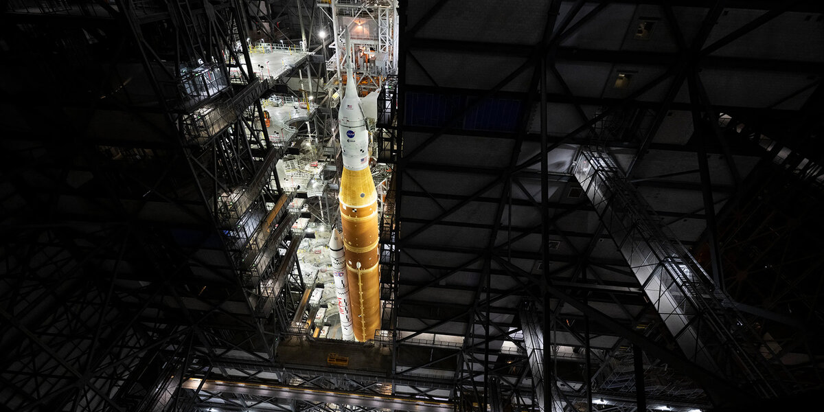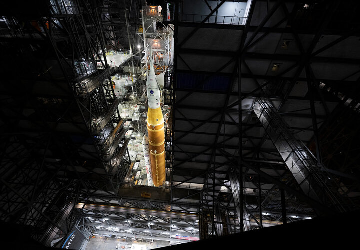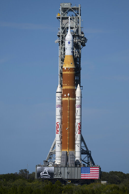 Am vergangenen Wochenende rollten Ingenieure die fast 100 Meter hohe Space Launch System-Rakete langsam und vorsichtig vom Vehicle Assembly Building zum Launch Complex 39B. Die 6,5 km lange Fahrt dauerte etwa 12 Stunden und wurde mit dem Crawler-Transporter der NASA durchgeführt, der seit über 50 Jahren Raketen zu Startrampen transportiert.