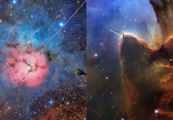 Hubbles Blick auf den Trifid-Nebel konzentriert sich auf einen «Kopf» und einen wellenförmigen «Körper» einer rostfarbenen Gas- und Staubwolke, die einem Seelemon oder einer Seeschnecke ähnelt, die scheinbar durch den Kosmos gleitet. Das linke «Horn» der kosmischen Seezitrone ist Teil von Herbig-Haro 399, einem Plasmastrahl, der seit Jahrhunderten in regelmässigen Abständen von einem jungen Protostern ausgestossen wird, der im Kopf der Seezitrone eingebettet ist. Beobachten Sie, wie sich der Strahl ausdehnt. Anhand der beobachteten Veränderungen können Forscher die Geschwindigkeiten der Ausflüsse messen und bestimmen, wie viel Energie der Protostern in diese Regionen einbringt. Die Messungen liefern Erkenntnisse darüber, wie neu entstandene Sterne mit ihrer Umgebung interagieren. Das dunklere, eher dreieckige «Horn» rechts vom «Kopf» beherbergt an seiner Spitze einen weiteren jungen Stern. Zoomen Sie heran, um einen schwachen roten Punkt mit einem winzigen Strahl zu sehen. Der grüne Bogen darüber könnte ein Hinweis darauf sein, dass eine zirkumstellare Scheibe durch das intensive ultraviolette Licht benachbarter massereicher Sterne abgetragen wird. Je klarer der Bereich um diesen Protostern ist, desto wahrscheinlicher ist es, dass seine Entstehung fast abgeschlossen ist.