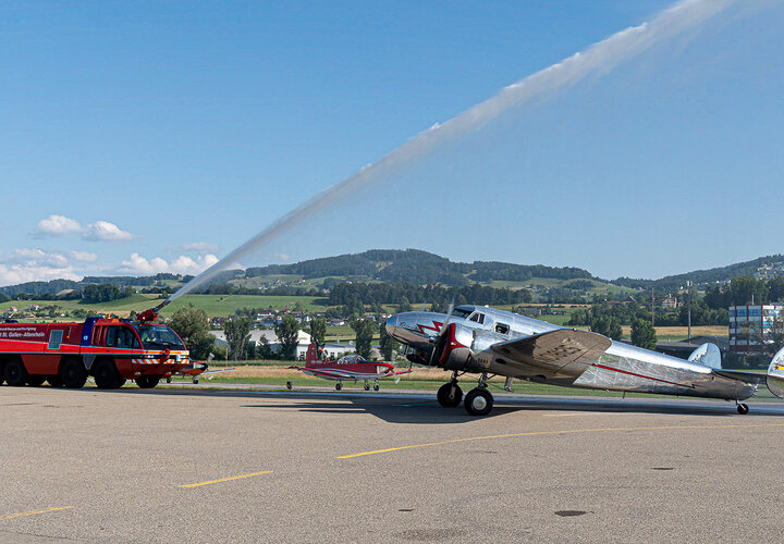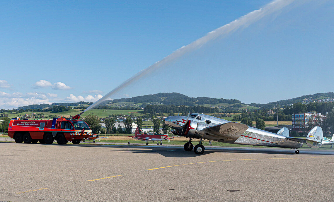 Am Montag, 12. Juni kam eine besondere Rarität am People’s Airport St.Gallen-Altenrhein an. Eine von weltweit nur noch sieben in Betrieb stehenden Lockheed Electra 12a Junior fand ihren weiten Weg aus den USA nach Altenrhein. Dort landete sie nach fünf Reisetagen und sechs Zwischenstopps am frühen Abend und wurde auf der neuen Homebase feierlich mit einem Wassersalut der People’s Flughafenfeuerwehr empfangen.