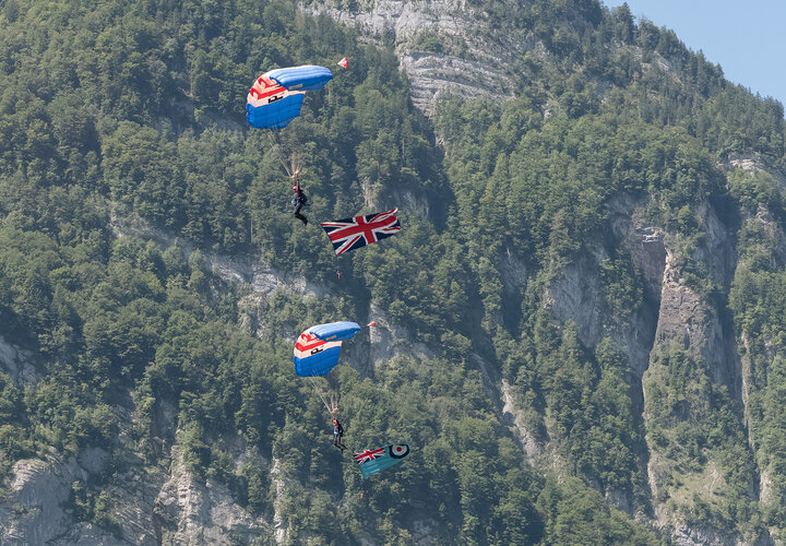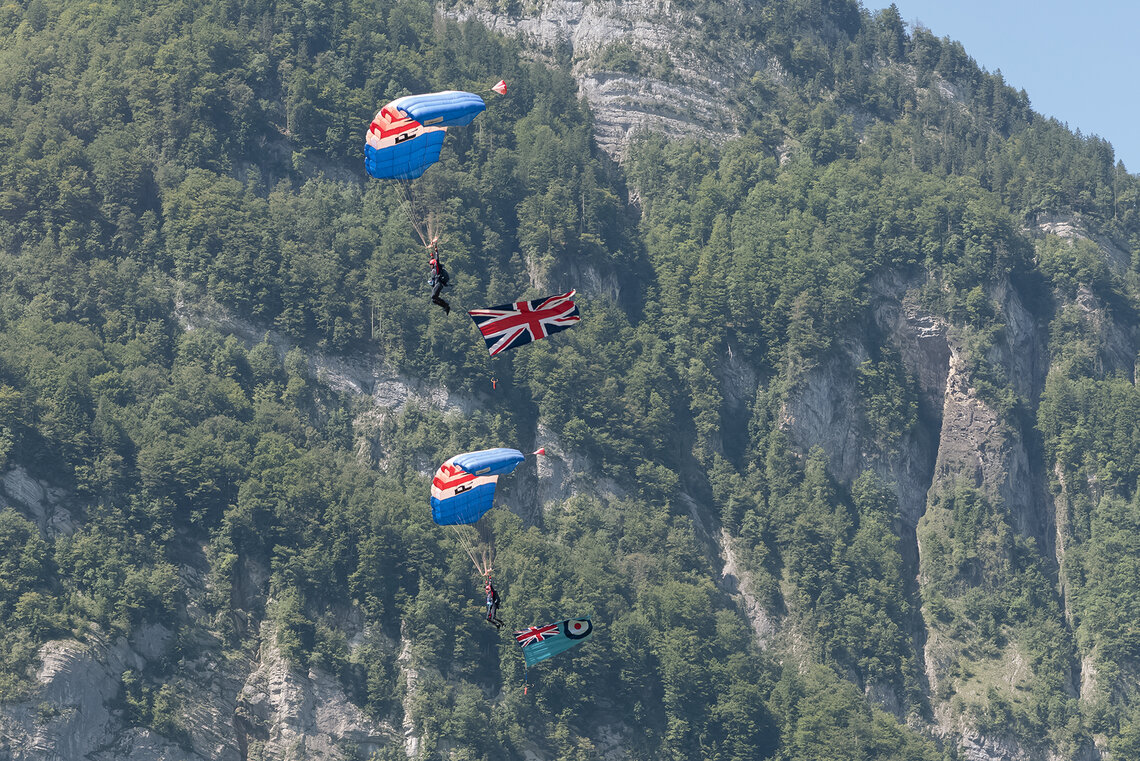 Christian Moullec und seine Gänse verzauberten zu Beginn der Mittagszeit. Die RAF Falcons eröffneten das Nachmittagsprogramm optisch. Ihr roter Rauch und die blau-weiss-roten Fallschirme kamen am stahlblauen Himmel besonders gut zur Geltung. Rauchige Herzen gab es später von den Flying Bulls und dem Blanix Team.