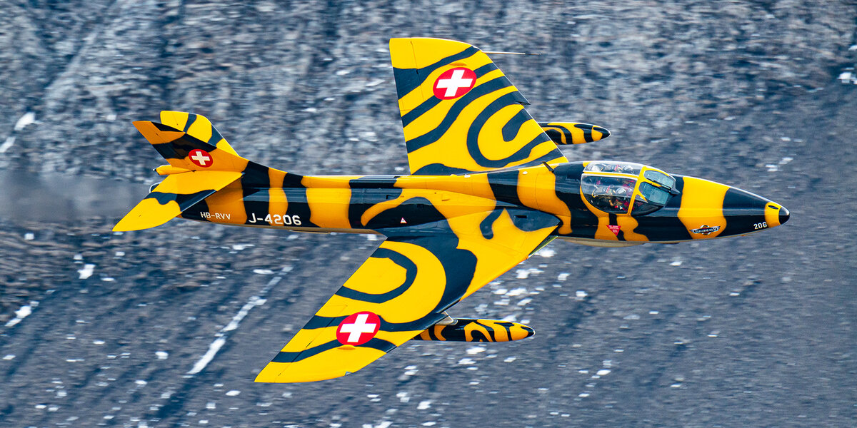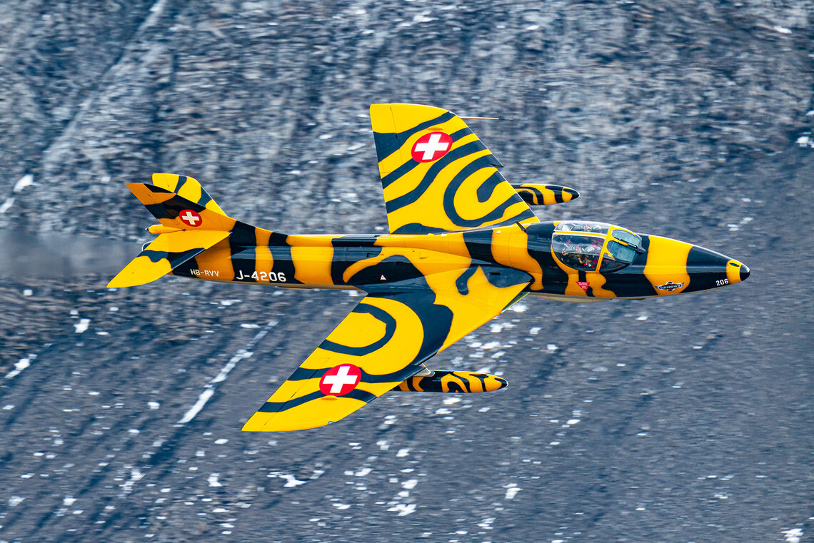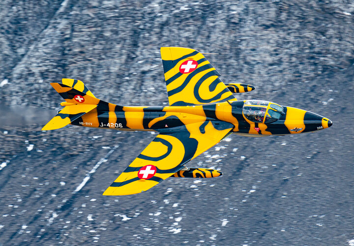 Immerhin 160 Ein- und Doppelsitzer Hunter taten einst in der Schweiz ihren Dienst. Bereits im April 1958 flog der erste Hunter bei der Schweizer Flugwaffe, zunächst als Jäger, später auch als Erdkampfflugzeug. Erstaunliche 36 Jahre lang dienten Hunter beim Schweizer Militär. Erst 1994 wurden die letzten Exemplare ausgemustert. Einige dieser demilitarisierten Maschinen gingen an Fliegerclubs, Privatpersonen oder Museen.