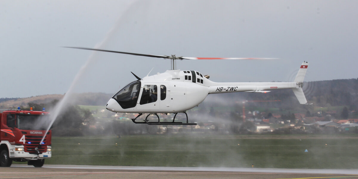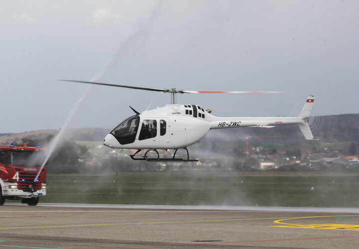 Der erste Bell 505 ist auf dem Flugplatz Grenchen eingetroffen. Das Schweizer Unternehmen Centaurium Aviation als unabhängiger Schweizer Vertreter für Bell-Helikopter hat gleich drei Helikopter dieses Typs erworben. Der schneeweisse Heli mit der Immatrikulation HB-ZWC wurde von der Flugplatzfeuerwehr Grenchen standesgemäss willkommen geheissen.