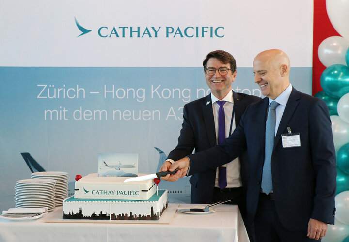 Am Sonntag, 31. März ist am Flughafen Zürich erstmals ein Airbus A350-1000 – das neue Flaggschiff der Flotte von Cathay Pacific Airlines– gelandet. Chris van den Hooven, Country Manager Switzerland bei Cathay Pacific, zeigte sich am offiziellen Willkommensanlass am 1. April höchst erfreut, dass die Linie Zürich-Hongkong als eine der ersten Strecken ausgewählt wurde, die mit dem neuen Aushängeschild der Langstreckenflotte der in Hongkong beheimateten Fluggesellschaft bedient wird: «Wir können bereits jetzt sagen, dass das Produkt bei den Schweizern sehr gut ankommt – mit den Vorausbuchungen für die nächsten Monate sind wir sehr zufrieden.»