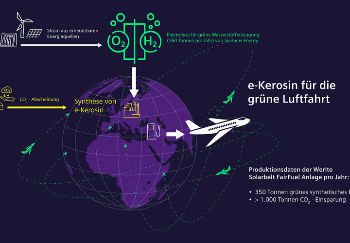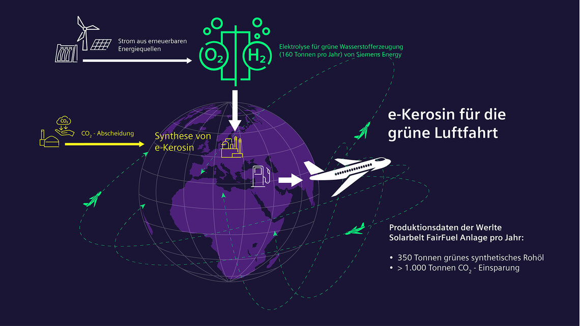 Kürzlich wurde in Norddeutschland die erste Anlage weltweit in Betrieb genommen, die industriell synthetisches Kerson produziert. Damit ist das E-Kerosin CO₂-neutral und hat keine weiteren negativen Umwelteffekte. Lieferant der Anlage in Werlte im Emsland ist Siemens. Zu den ersten Kunden gehört die Lufthansa.