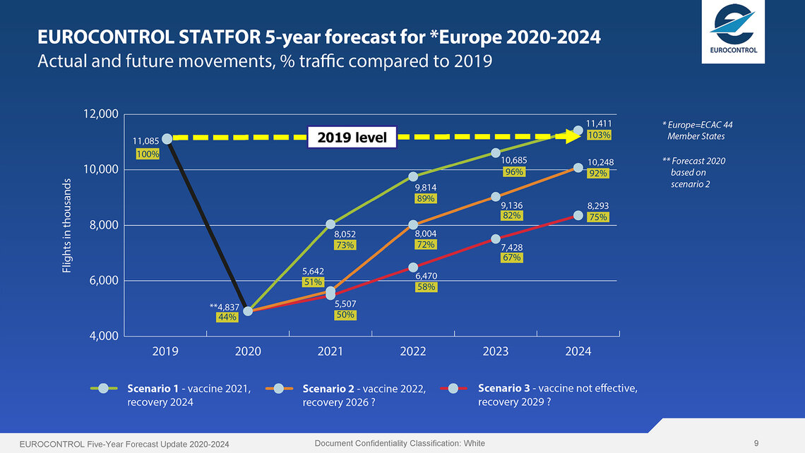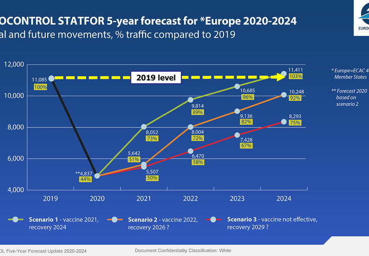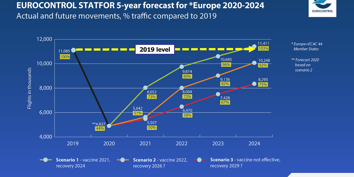 Die neuste Prognosse von Eurocontrol über die mögliche Entwicklung des Luftverkehrs in Europa in den kommenden fünf Jahren basiert auf drei Szenarien. Im optimistischsten Szenario wird prognostiziert, dass der Verkehr bis 2024 wieder auf das Niveau von 2019 zurückkehren wird. Im zweiten und wahrscheinlichsten Szenario würde der Verkehr im Jahr 2024 jedoch nur 92% des Niveaus von 2019 erreichen. Im dritten Szenario würde das Verkehrsaufkommen im Jahr 2024 75% des Wertes von 2019 betragen und erst 2029 die Zahlen von 2019 erreichen.