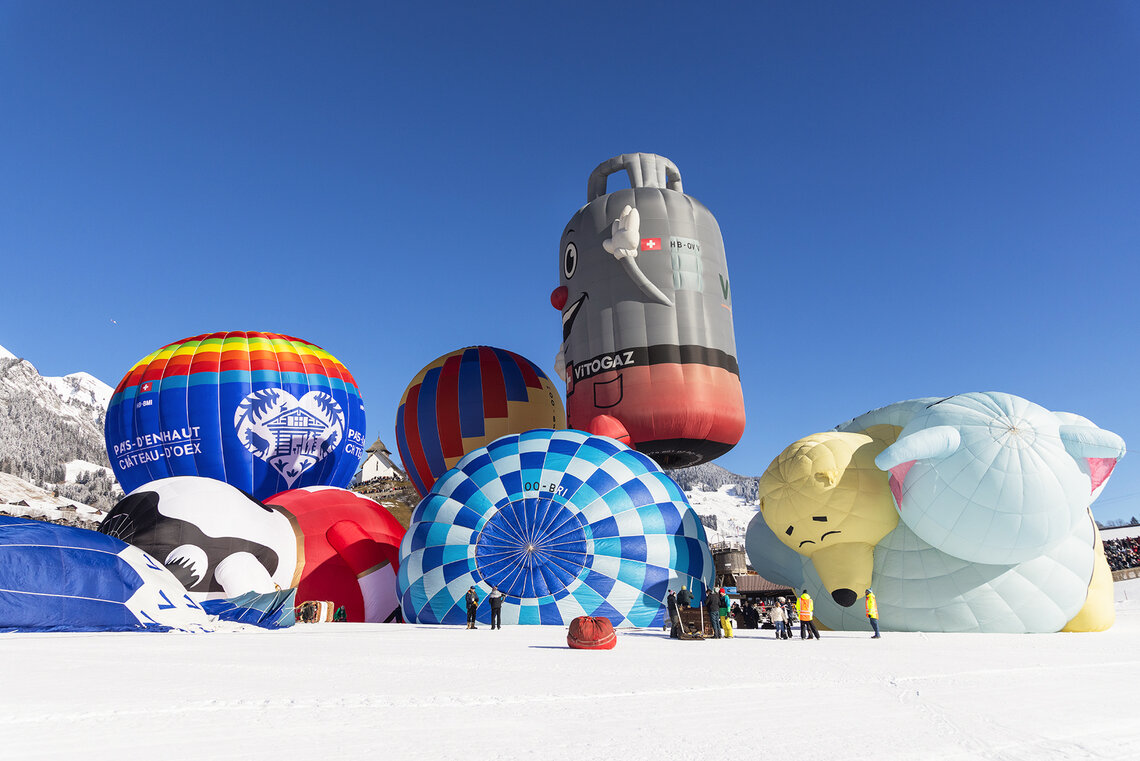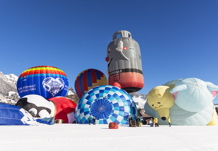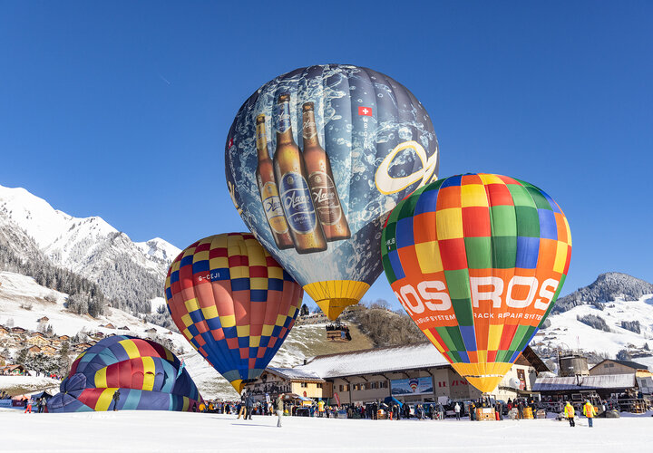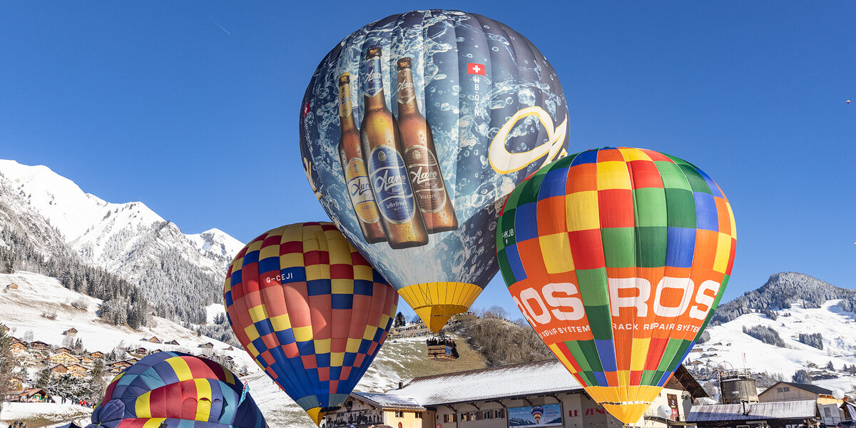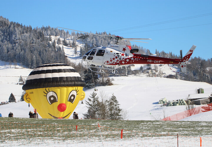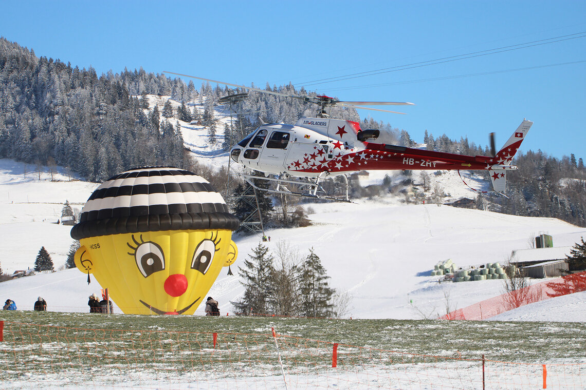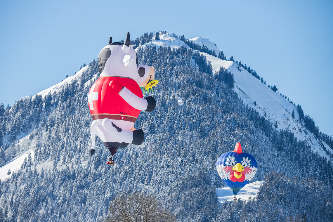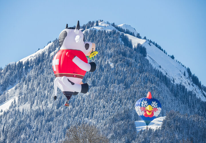 «Kuh «Blüemli» trifft Hahn in luftiger Höhe und vor verschneiter Kulisse.» Zu solchen Szenen kommt es wohl nur am Festival International de Ballons in Château-d’Œx. Die 44. Ausgabe startete am 20. Januar bei prächtigem Winterwetter. Das Festival dauert eine Woche und bietet neben Ballonsport auch ein attraktives Rahmenprogramm.