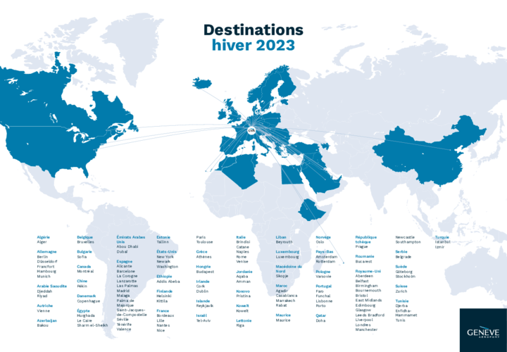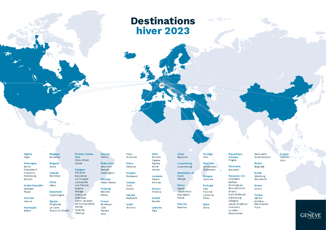 Die Wiederaufnahme der Langstreckenflüge nach Abu Dhabi, Addis Abeba, Doha, Dubai, Montreal, New York, Peking und Washington ist ein bedeutendes Element in der Strategie des Genève Aéroport. Diese Direktverbindungen zu den wichtigsten wirtschaftlichen und politischen Zentren stärken die Position von Genf als Sitz zahlreicher internationaler Organisationen und Unternehmen. Diese wichtige Konnektivität erleichtert den diplomatischen, kommerziellen, sportlichen und kulturellen Austausch zwischen Genf und dem Rest der Welt. Als wichtigste Neuerung im Winterflugplan bezeichnet Genf aber die Wiederaufnahme mit zwei wöchentlichen Rotationen nach Mauritius, die von Air Mauritius angeboten werden.