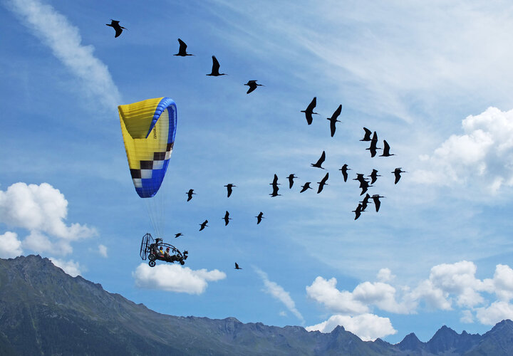 Mithilfe von geeignetem langsamen Fluggerät werden die Jungvögel in möglich neue und geschützte Brutgebiete begleitet.