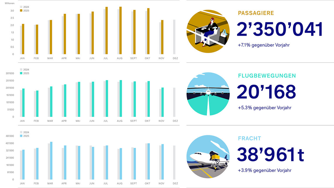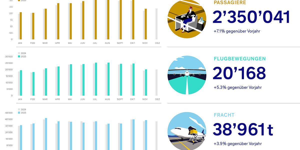 Im November 2025 sind 2’350’041 Passagiere über den Flughafen Zürich geflogen. Das entspricht einem Plus von 7.1% gegenüber derselben Periode des Vorjahres. Die Anzahl Lokalpassagiere lag im November 2025 bei 1’612’777. Der Anteil der Umsteigepassagiere betrug 31.3%, was 734’056 Passagieren entspricht.