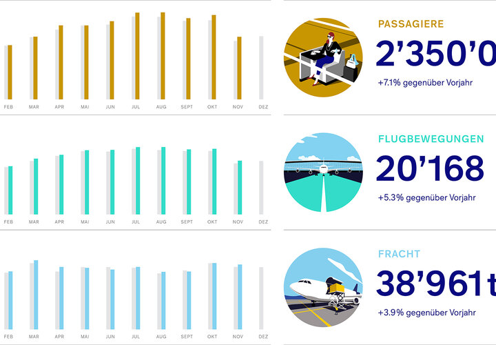 Auch die Abwicklung von Fracht hat gegenüber dem Vorjahresmonat zugenommen. Insgesamt wurden am Flughafen Zürich im November 38’961 Tonnen Fracht abgewickelt. Das entspricht einer Zunahme von 3.9% gegenüber dem Vorjahresmonat.