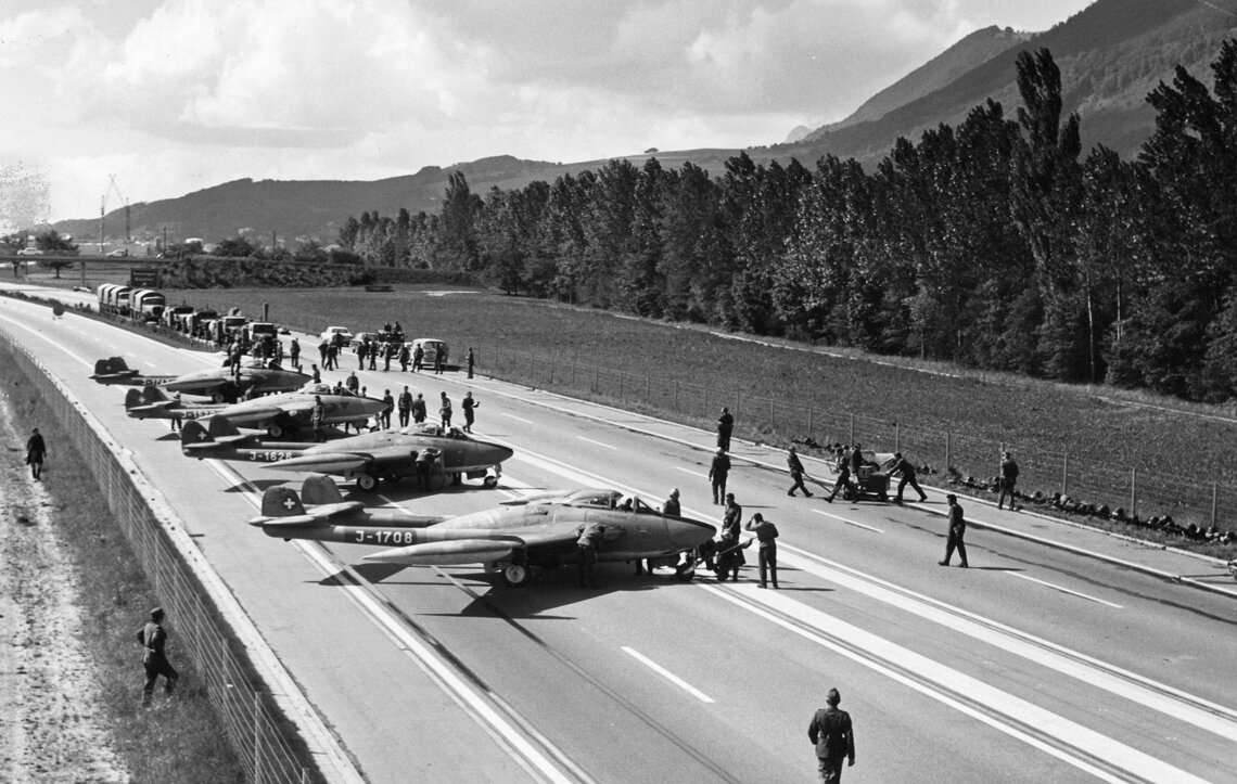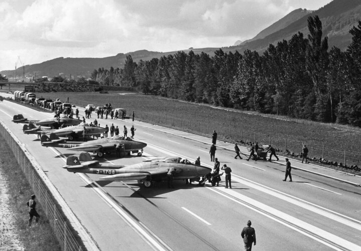 So könnte man die Absicht der Schweizer Luftwaffe umschreiben. Gemäss Dezentralisierungskonzept werden nämlich Landungen auf der Autobahn wieder zum Thema – und nicht nur dort. Die Luftwaffe hält sozusagen Ausschau nach geraden und befestigten Strecken, welche mindestens zwei oder mehr Kilometer lang sind und sich für Starts und Landungen von Kampfjets eignen. Ehemalige Militärflugplätze etwa, oder Autobahnabschnitte. Auf der Autobahn landen und starten: Das will freilich trainiert werden. Auf der A1 in der Nähe von Payerne wird darum ein Teil der Autobahn vom 4. bis 6. Juni 2024 von der Luftwaffe während maximal 36 Stunden zu einem Nebenstandort umfunktioniert und für den Strassenverkehr gesperrt werden. Nicht zum ersten Mal. Startende und landende Kampfjets auf der Autobahn waren schon einmal begehrte Fotosujets, wie unsere Bilder und ein Blick zurück in jene Zeiten zeigen.