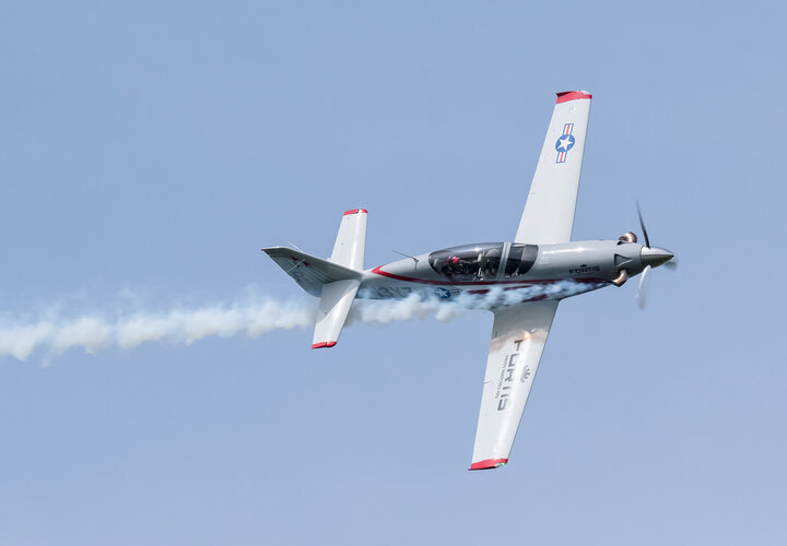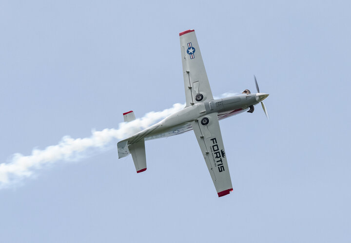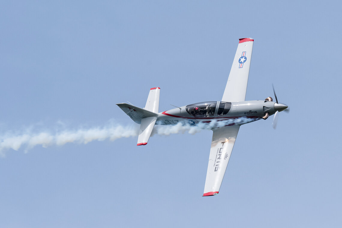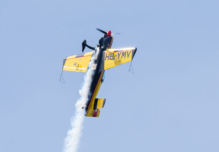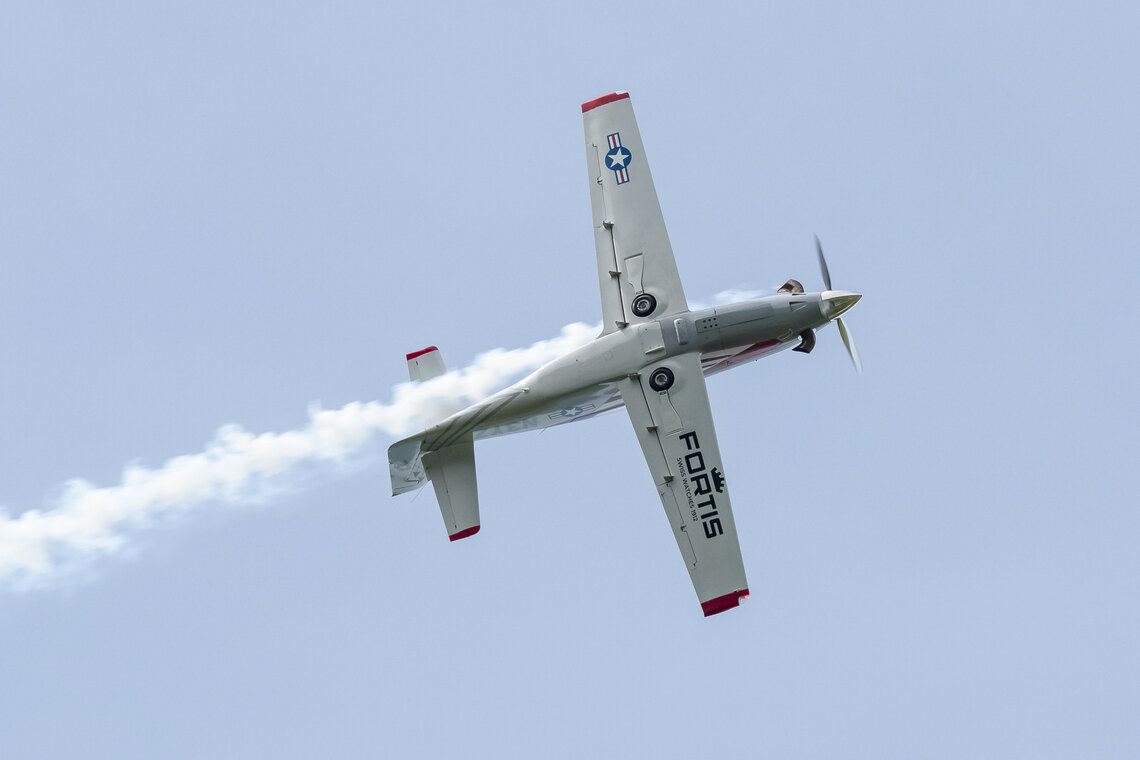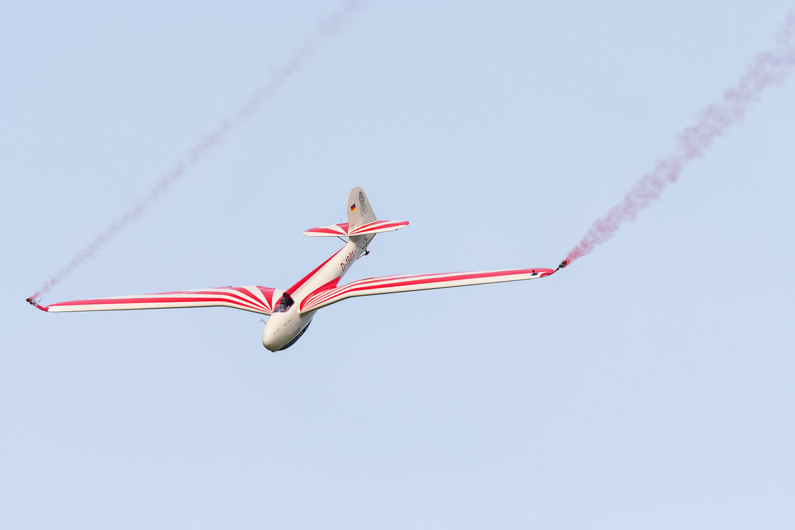 Kunstflugzeuge wie die Votec 351 zeigten aerobatische Vorführungen und schmucke Oldtimer, wie sie in Langenthal sowieso zum täglichen Bild gehören, zeigten sich von ihren schönsten Seiten. Zu Gast bei einer Segelfluggruppe darf selbstverständlich auch eine Vorführung dieser Flugdispziplin nicht fehlen. Gezeigt wurde beeindruckender Segelkunstflug mit einem DFS Habicht. Wenn ein Programmpunkt nicht bereit war, sprangen die Modellflieger ein. Starfighter, PC-21 und Bücker waren in verkleinertem Massstab zu bewundern.