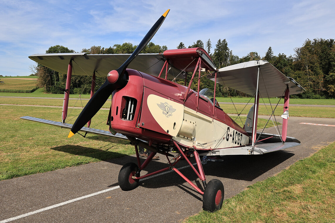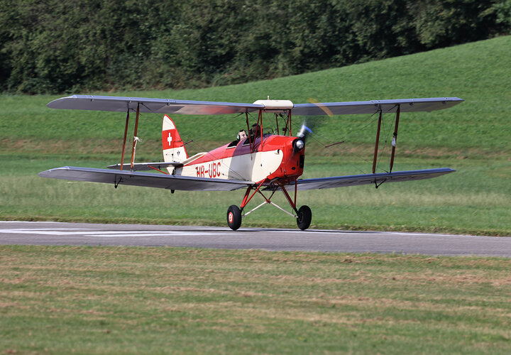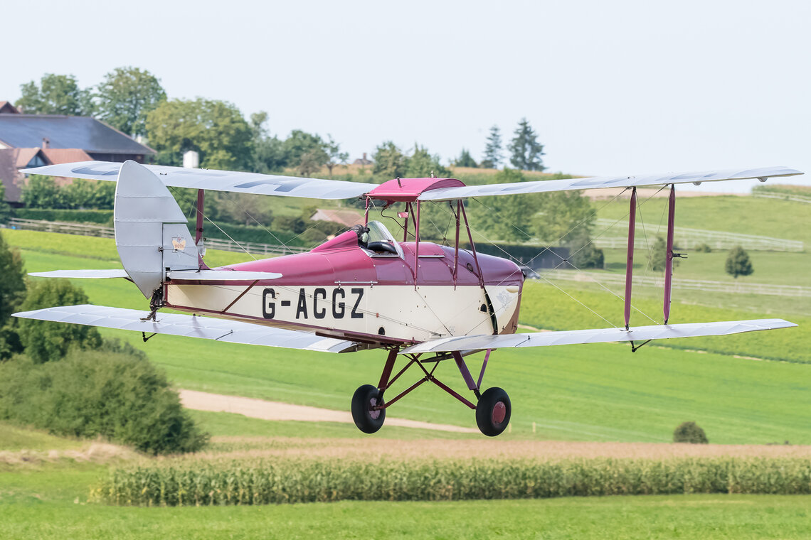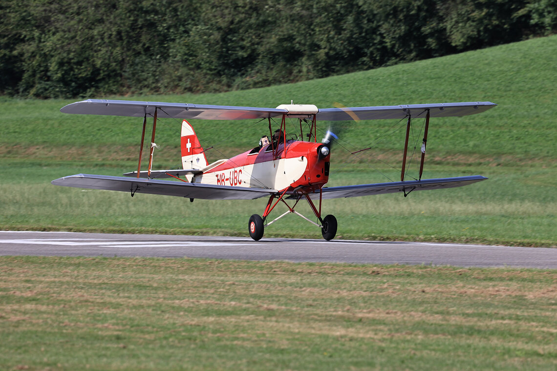 Sehr zur Freude des Publikums und zur Überraschung der Organisatoren setzte gegen Ende des Nachmittags die D.H.89A Dragon Rapide zur Landung an, so dass das Flugzeug auch noch aus der Nähe bewundert werden konnte. Ebenfalls zugegen war eine D.H.83 Fox Moth / G-ACEJ. Sieben Stunden hatte die Anreise von Nigel Lemon mit der De Havilland DH.60G III Moth Major / G ACGZ aus England gedauert. Der Brite zeigte leichten Kunstflug, hielt aber eine Sicherheitshöhe ein.