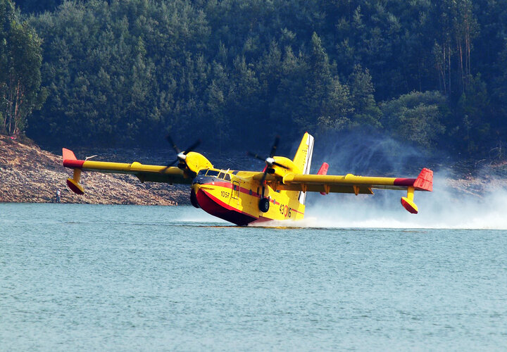1975 wurde auch der Transporter Transall eingesetzt, für den eigens Rüstsätze zur Aufnahme von 12'000 Liter Wasser von der Firma MBB entwickelt wurden. Die Betankung benötigt zwar eine gewisse Zeit, doch bei Löscheinsätzen kann das Wasser ebenfalls in 3 bis 7 Sekunden ausgebracht werden. Mittelmeerländer begegnen Wald- und Buschbrände vornehmlich mit speziellen Wasserbombern der Typen Canadair CL 215, 215T und 415, der Turbopropversion. Diese können im Touch-down über der Wasseroberfläche innerhalb von 12 Sekunden bis zu 6400 Liter Wasser aufnehmen und über einen Streifen den Brand bekämpfen. Die bis zu 333 km/h schnellen Flächenflugzeuge bewähren sich bereits seit Jahrzehnten und das ursprünglich auch in der Kolbenmotorversion CL 215.