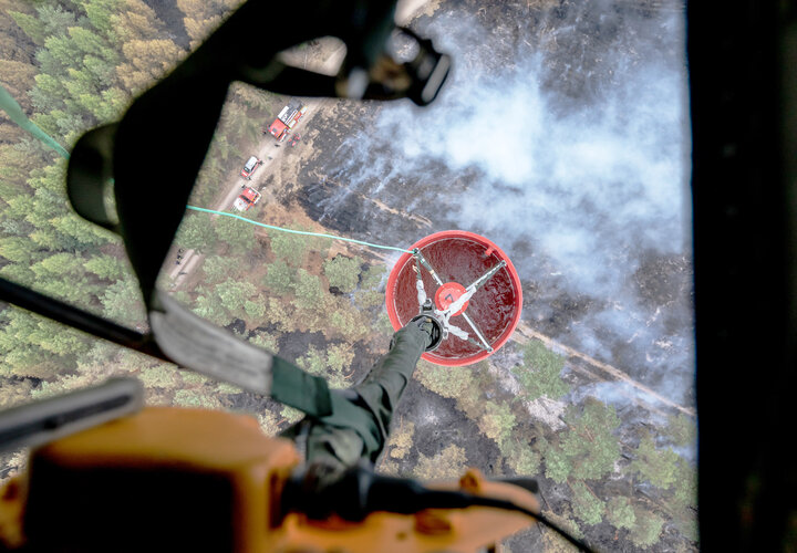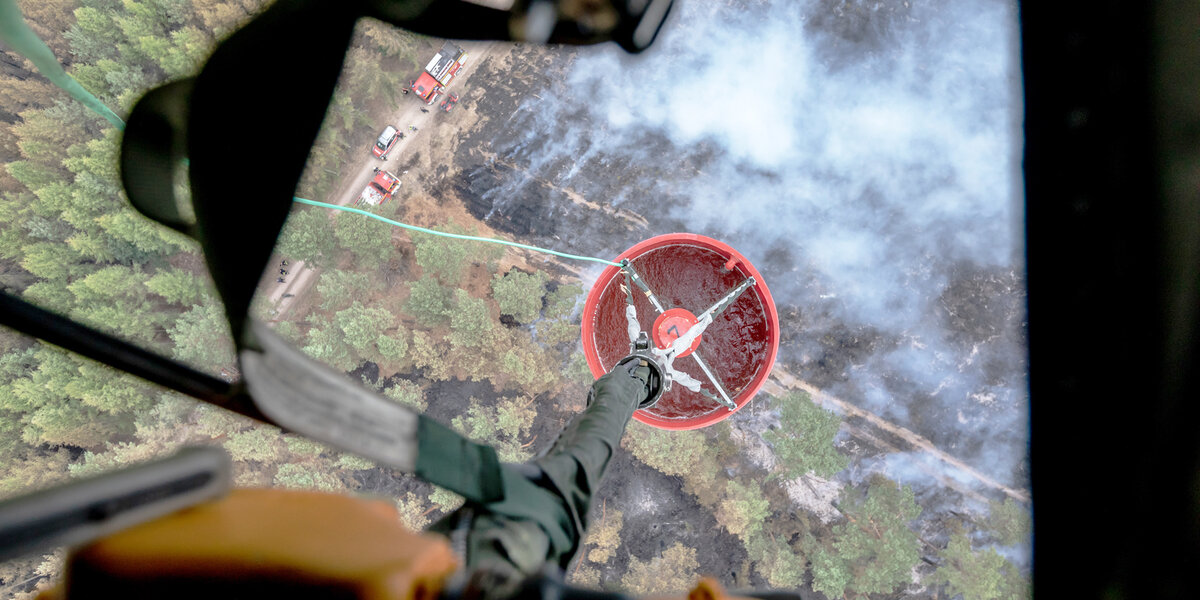Schon 1975 litt die Lüneburger Heide, südlich von Hamburg, in einem extrem heissen Sommer unter grossflächigen Heide- und Buschbränden. Damals wie heute rückte die Bundeswehr mit ihren Transporthubschraubern an, dazu wurde ein Transportbehälter zum Abwurf von 5000 Liter Wasser auf Brände entwickelt. «Smokey» ist eine Art Wassersack, der von den Helis herabgelassen wird und sich sofort füllt. Nach kurzem Flug am Einsatzort angekommen, öffnet sich ein großes Bodenventil und so kann das Löschwasser vor allem auch punktuell innert Sekunden ausgebracht werden. Bundeswehreinsätze erfolge in Rahmen von Amtshilfeersuchen über dasa Innenministerium.