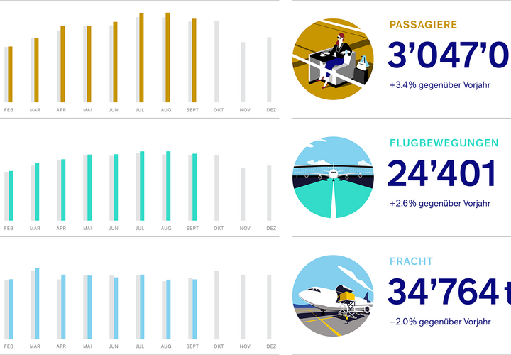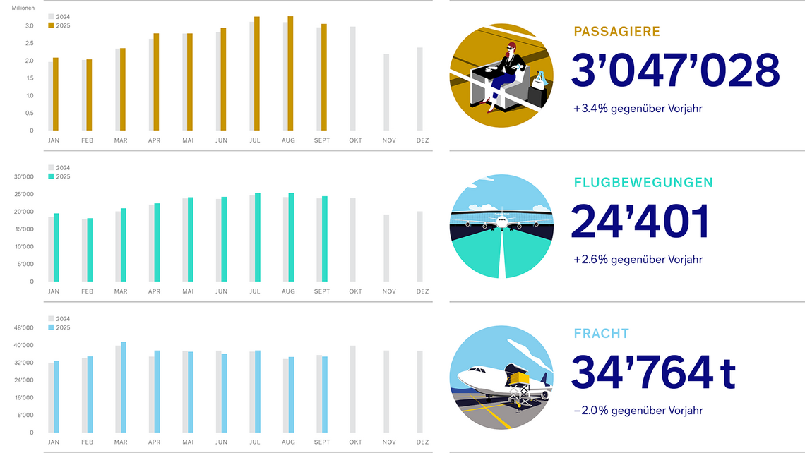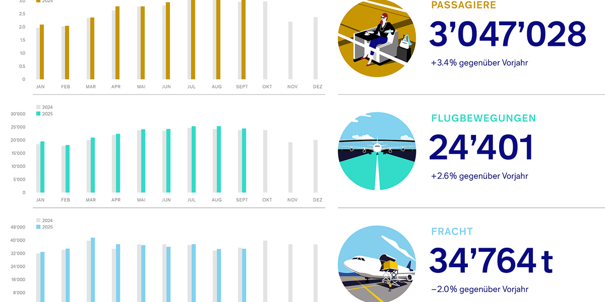 Die Anzahl Lokalpassagiere lag im September 2025 bei 2’201’675. Der Anteil der Umsteigepassagiere betrug 27.6%, was 840’224 Passagieren entspricht. Die Anzahl Flugbewegungen stieg im Vergleich zum Vorjahresmonat um 2.6% auf insgesamt 24’401 Starts und Landungen. Die durchschnittliche Zahl Passagiere pro Flug lag mit 142.4 Fluggästen 0.7% über dem Vorjahreswert. Die Sitzplatzauslastung ist im Berichtsmonat im Vergleich zum Vorjahresmonat um -0.5 Prozentpunkte auf 83.1% gesunken. Insgesamt wurden am Flughafen Zürich im September 34’764 Tonnen Fracht abgewickelt. Das entspricht einer Abnahme von 2.0% gegenüber dem Vorjahresmonat.