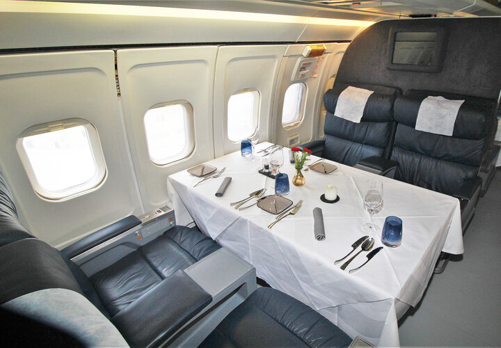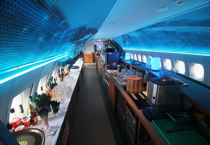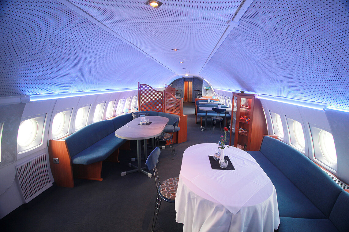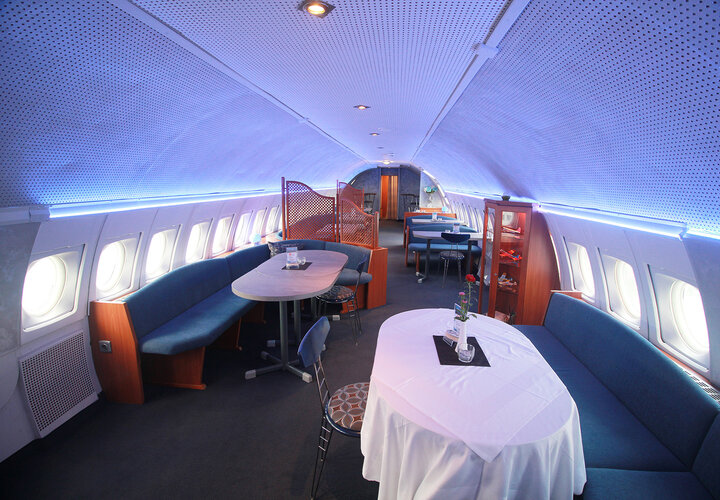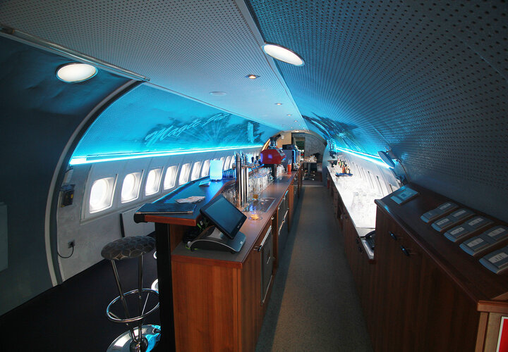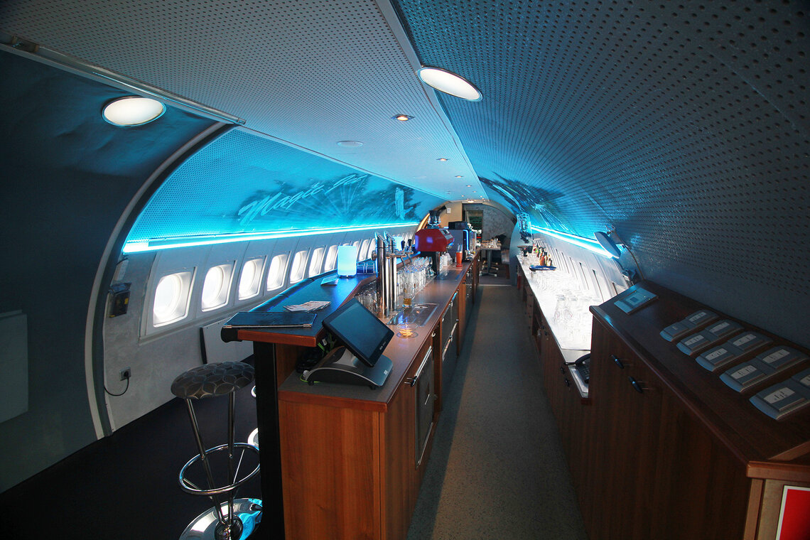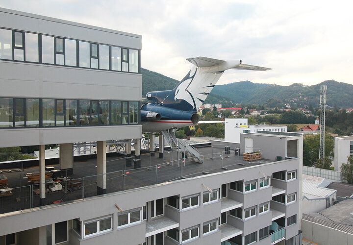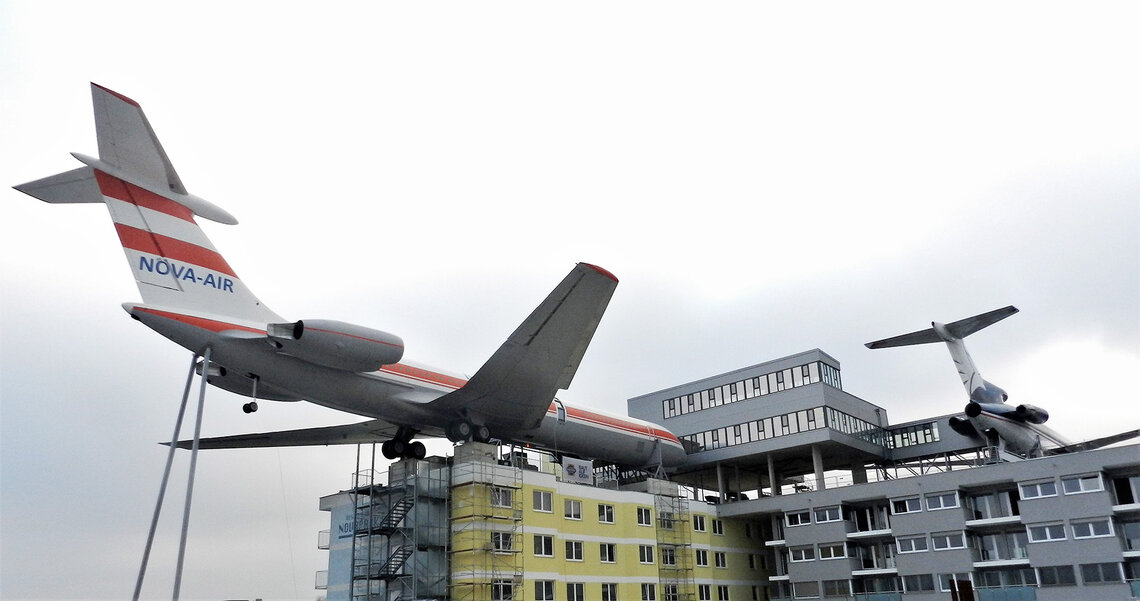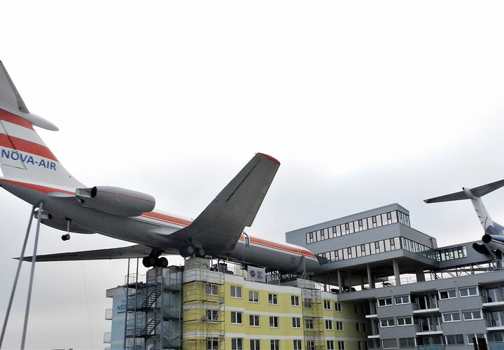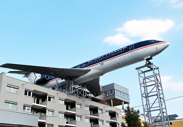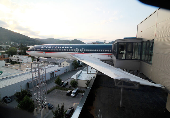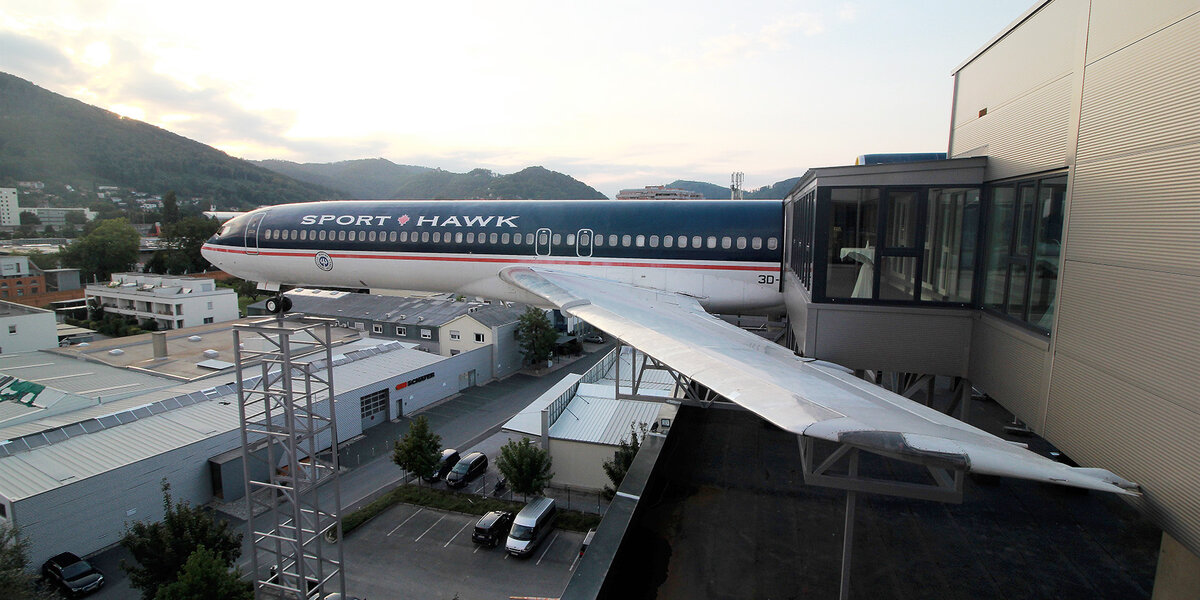 Der innovative Hotelunternehmer Helmut Neukam aus Graz, beruflicher Vielflieger und ausgestattet mit einer grossen Affinität zur zivilen Luftfahrt, erfüllte sich einen persönlichen Traum und «groundete» zwei ehemalige Passagierflugzeuge: eine Boeing B727-200 und eine Iljuschin IL-62M. Die beiden Maschinen auf dem Dach des Hotels sind nicht nur Augenweide und Blickfang, sondern auch Restaurant und Bar.