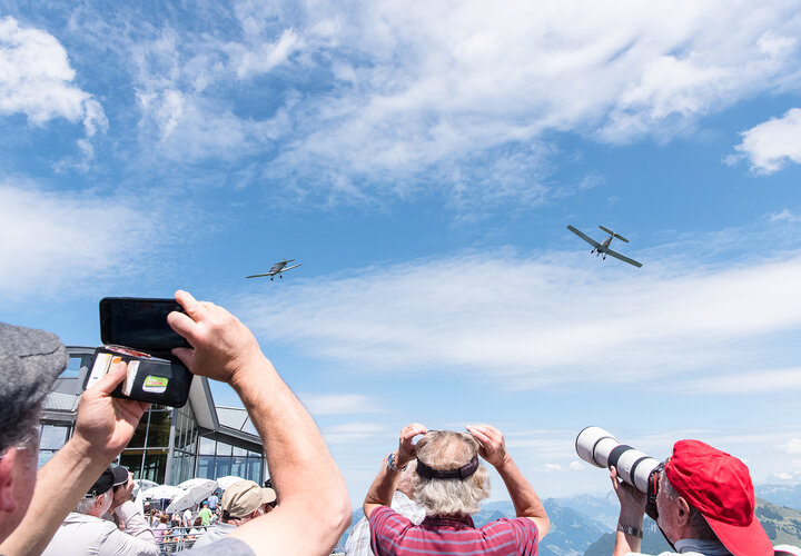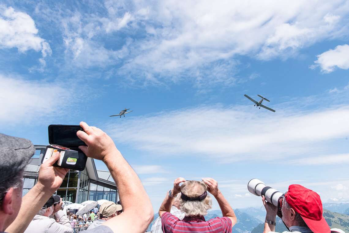 Neben Tagestouristen aus der Schweiz kommen nun auch wieder Touristen aus fernen Ländern aufs Stanserhorn. Sie haben wenig Zeit, wollen nur kurz ein Erinnerungsbild mit dem Titlis im Hintergrund schiessen. Sie staunen, als sie das Ausrüstung der Fotografen sehen, die sich zuvorderst auf der Plattform in Stellung gebracht haben. Als die Flugparade beginnt, sind sie schon wieder auf der Weiterreise. Um den Titlis haben sich inzwischen Wolken gebildet.