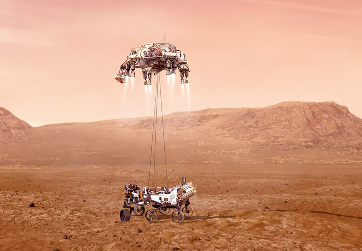 Etwa 2,1 Kilometer über dem Boden bei einer Abstiegsgeschwindigkeit von immer noch rund 300 Kilometern pro Stunde wird die Hülle mit dem Fallschirm abgesprengt und die Landetriebwerke zünden. Diese steuern das Raumfahrzeug zur ausgewählten Landestelle und bremsen es bis auf 2,7 Kilometer pro Stunde in 20 Metern über der Oberfläche ab. An diesem Punkt leitet die Landestufe das sogenannte «Sky Crane-Manöver» ein: Nach dem Ausklappen der sechs Räder wird der Rover von der Grösse eines Kleinwagens und einer Masse von 1025 Kilogramm an drei sich abrollenden Nylonseilen 7,6 Meter von diesem «Himmelskran» unter die Landestufe abgesenkt. Wenn Perseverance Bodenkontakt zur Abstiegsstufe meldet und der Rover im Jezero-Krater steht, durchtrennen pyrotechnisch gezündete Klingen die Seile. Die in der Luft verbliebene Antriebseinheit fliegt davon, bevor sie in sicherer Entfernung auf der Marsoberfläche aufschlägt. Wegen der Signallaufzeiten vom Mars zur Erde erhält das Kontrollzentrum am Jet Propulsion Laboratory der NASA in Kalifornien alle Statussignale mit rund 11 Minuten Verzögerung und kann in den automatischen Landeablauf nicht eingreifen.