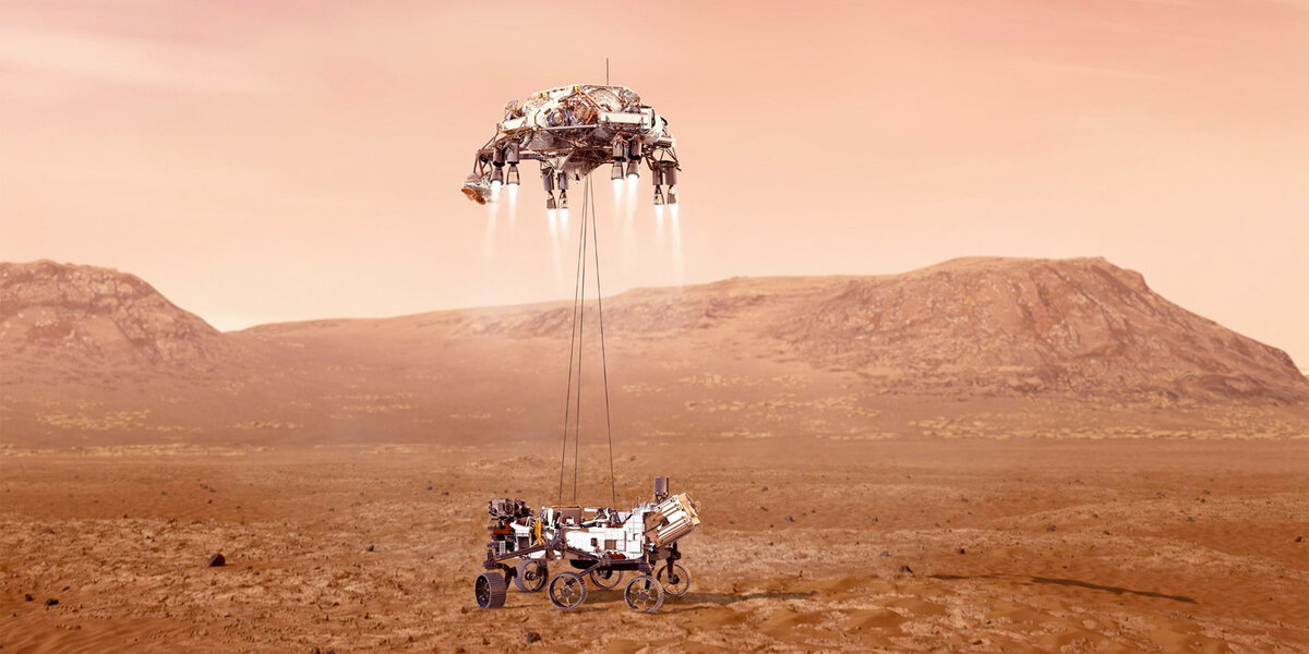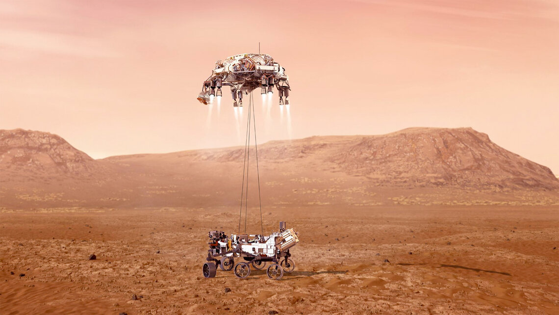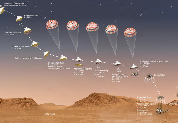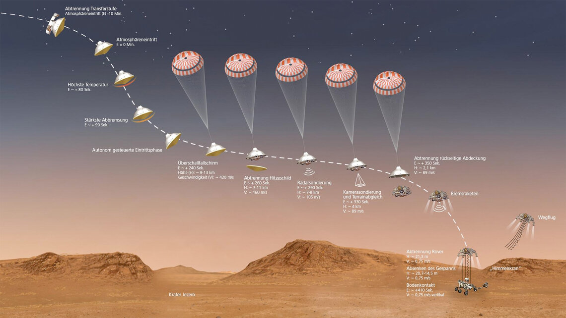 Am 18. Februar 2021 wird die NASA die präziseste Landung auf dem Roten Planeten einleiten, die es je gegeben hat. Eine Raumsonde mit dem Rover Perseverance (Beharrlichkeit) im Gepäck wird etwa um 21:38 Uhr (MEZ) mit knapp 19.500 Kilometer pro Stunde in die Marsatmosphäre eintreten. In sieben entscheidenden Minuten bremst das Raumfahrzeug dann mit Hitzeschild, Fallschirm und Bremstriebwerken auf null, um den Rover um 21:45 Uhr (MEZ) an Seilen schwebend im Krater Jezero abzusetzen. Wegen der Signallaufzeit von etwa elf Minuten vom Mars zur Erde wird die Bestätigung der Landung frühestens um 21:55 (MEZ) im Kontrollzentrum der NASA im Jet Propulsion Laboratory (Pasadena, Kalifornien) eintreffen.