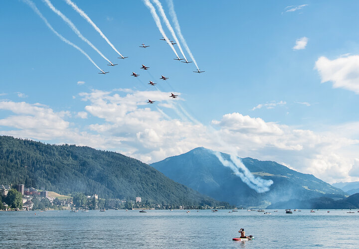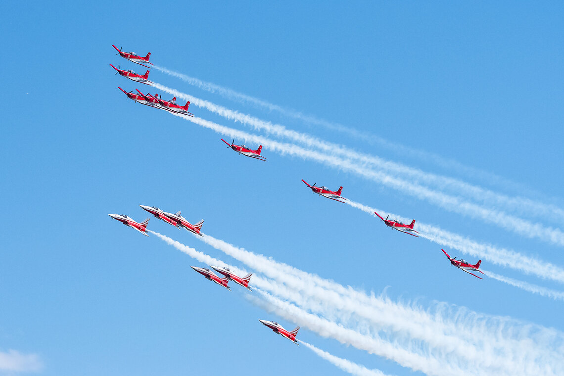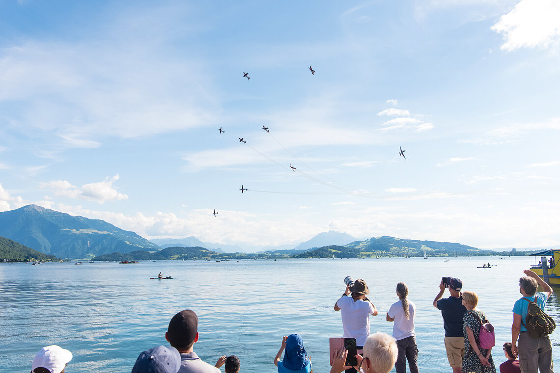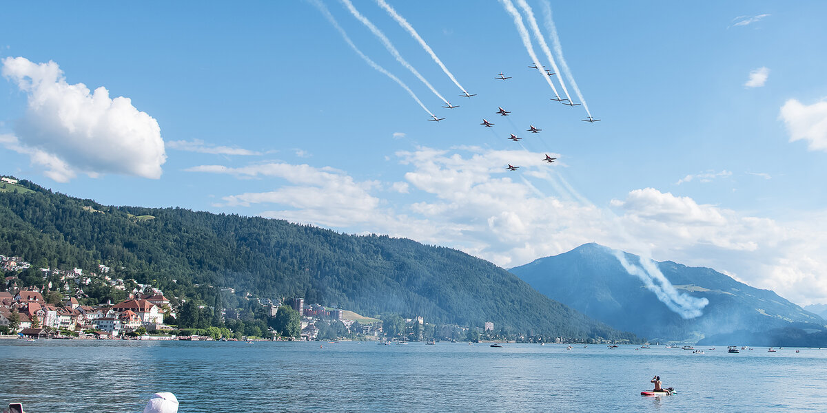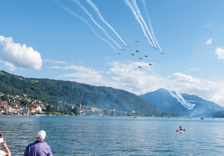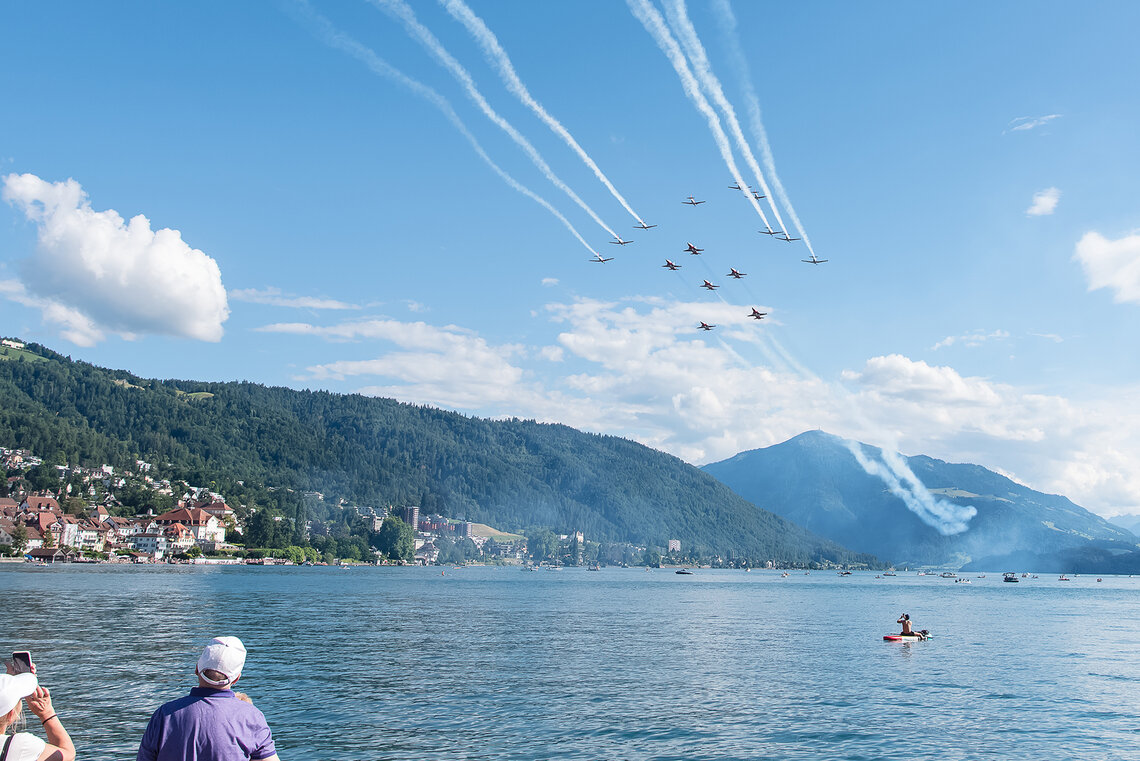 Am letzten Juni-Wochenende feiert Zug traditionell das Seefest. In den vergangenen Jahren flogen entweder das PC-7 TEAM oder die Patrouille Suisse. Dieses Jahr lud der Veranstalter beide Teams ein. Diese sorgten für Gänsehaut-Momente beim Publikum.