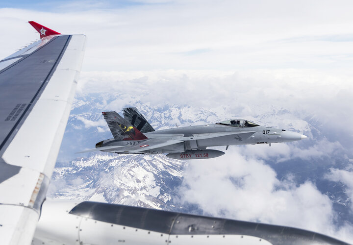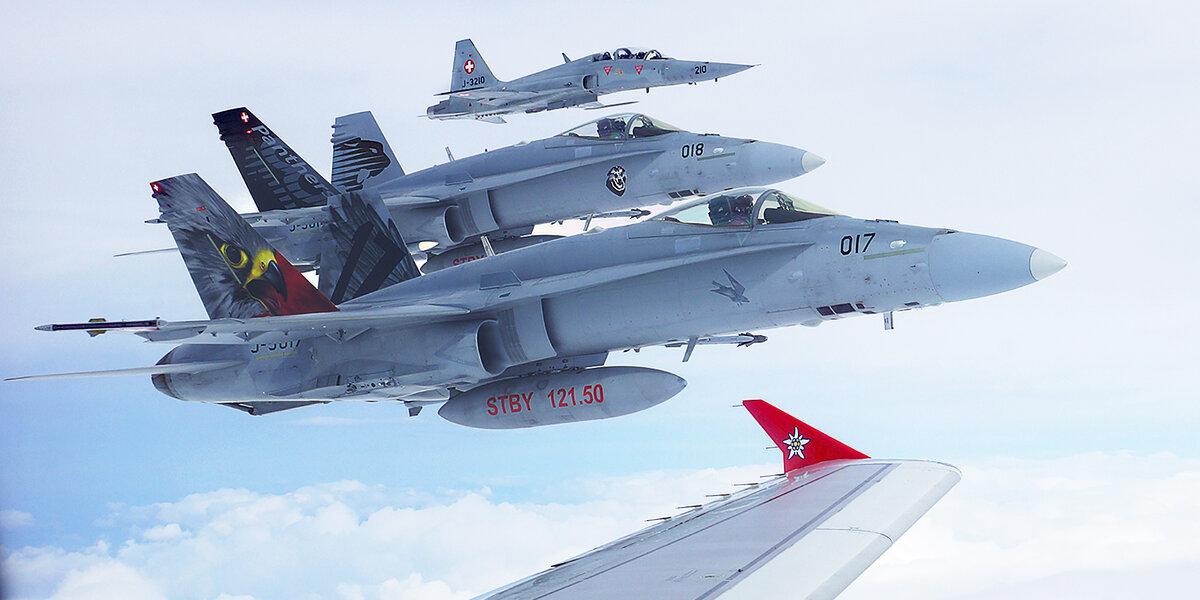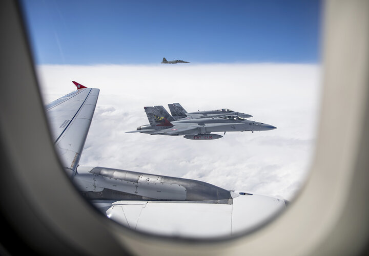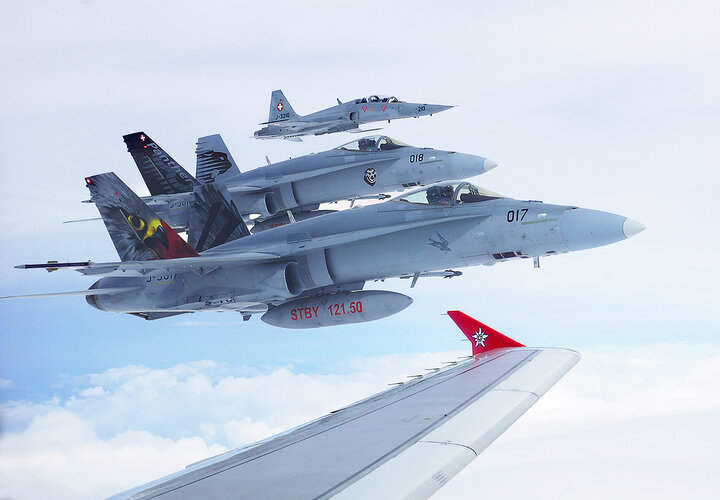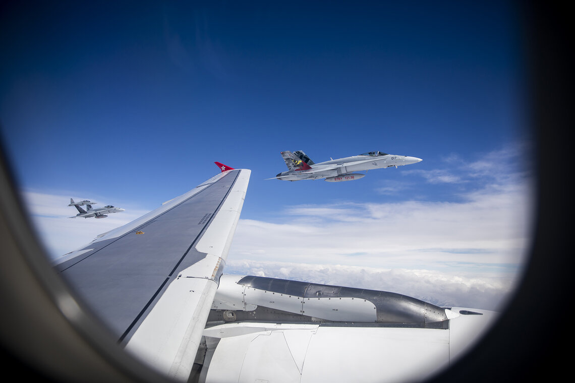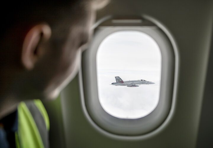 Die wohl einmalige Gelegenheit, aus dem Bordfenster eine Interzeptionsübung der Luftwaffe mitverfolgen zu können, liess die jungen Passagiere an den Fenstern «kleben» und unzählige Fotos schiessen. Die Begeisterung war gross. Kein Wunder: Man glaubte, die beiden Kampfjets berühren zu können; sehr nah und äusserst präzise begleiteten sie den Edelweiss-Jet.