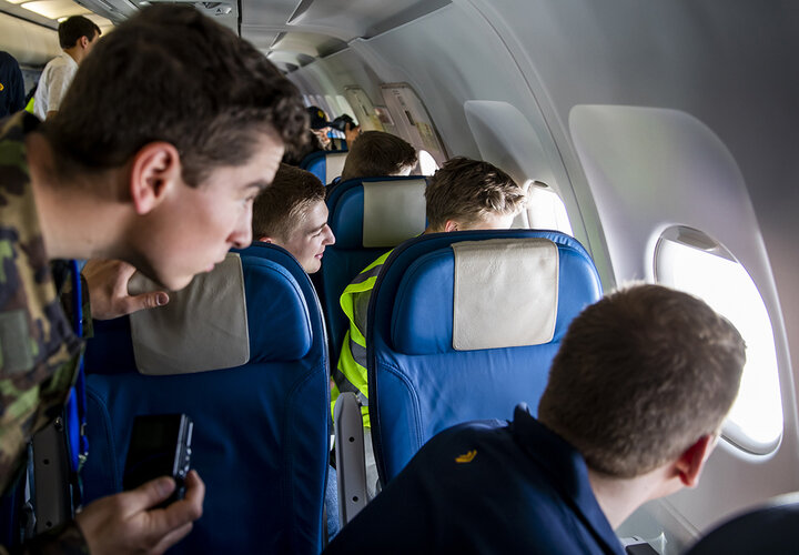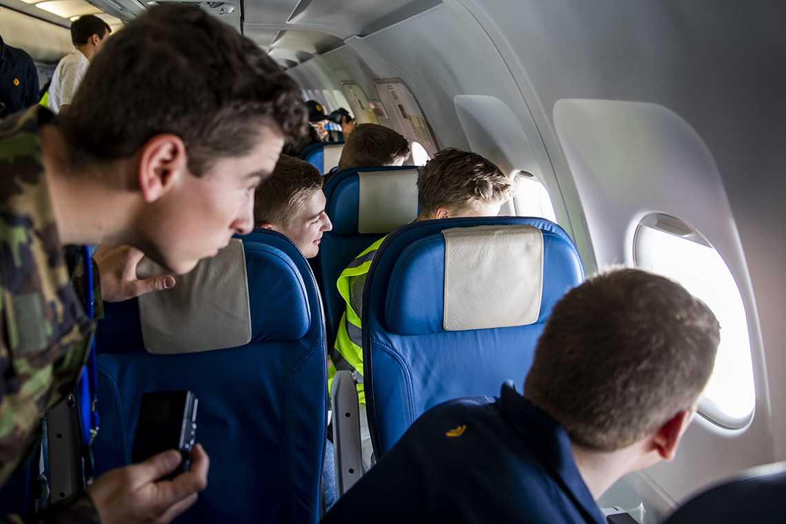 Attraktiver kann man den Pilotenberuf nicht präsentieren. Am SPHAIR Experience Day vom 3. April 2019 erhielten rund 100 SPHAIR-Absolventen die Gelegenheit, zwei F/A-18-Jets im Rahmen eines Luftpolizei-Einsatzes bei ihrer Mission hautnah mitzuerleben. An Bord eines Airbus A320 der Fluggesellschaft Edelweiss Air, welcher – so wollte es die Übung – infolge eines Ausfalls der Bordelektronik nach dem Start auf dem Flughafen Zürich per Funk nicht mehr erreichbar war, konnten sie miterleben, wie sich die beiden Kampfjets nach dem Alarmstart in Payerne von hinten links zur Identifizierung dem Passagierjet annäherten und diesen nach den internationalen Abfangregeln durch Zeichen wie das Wackeln der Flügel oder das Ausstossen von Flares aufforderten, den Anweisungen Folge zu leisten.