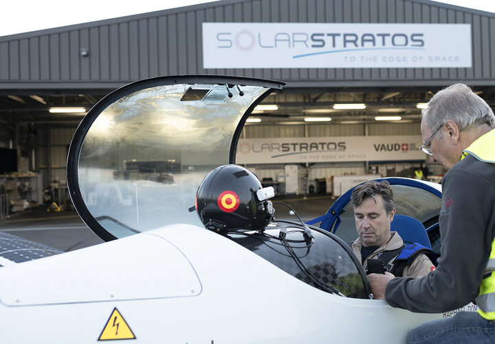 SolarStratos ist ein zweisitziges Stratosphären Solarflugzeuge, das auf eine Konstruktion von Calin Gologan (Electra Solar) zurückgeht. Das mit einem Elektromotor und Solarzellen ausgerüstete Flugzeug, ursprünglich in Deutschland (Carbon Wacker) gebaut, war schon einmal für 7 Minuten in der Luft. Bei einem Belastungsversuch zeigten sich aber gewisse Schwächen im Flügel und die linke Flügelhälfte ging vorzeitig zu Bruch. Nach einer zweijähriger Pause und einem neuen Flügelsatz war man wieder bereit, die Flugversuche neu aufzunehmen. Das SolarStratos-Solarflugzeug hob am 23. Juli frühmorgens um 6.50 Uhr ab, um von den optimalen Wetterbedingungen zu profitieren. Das mit den neuen Tragflächen ausgestattete Flugzeug stieg nach dem Start zunächst auf eine Flughöhe von 800 Metern und landete 20 Minuten später wieder sicher auf dem Boden.