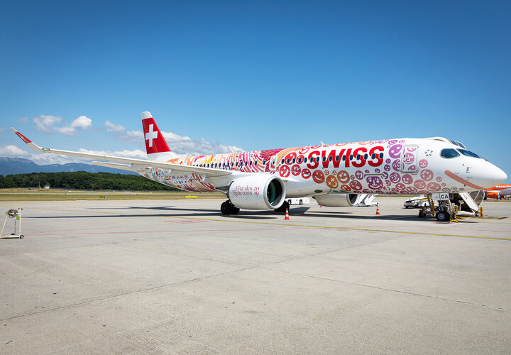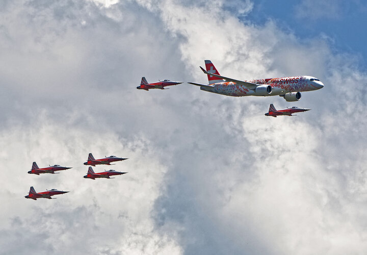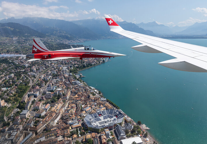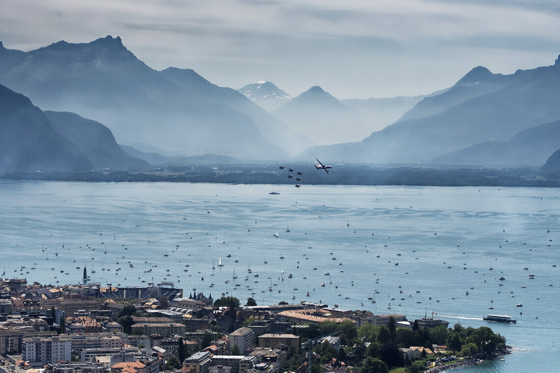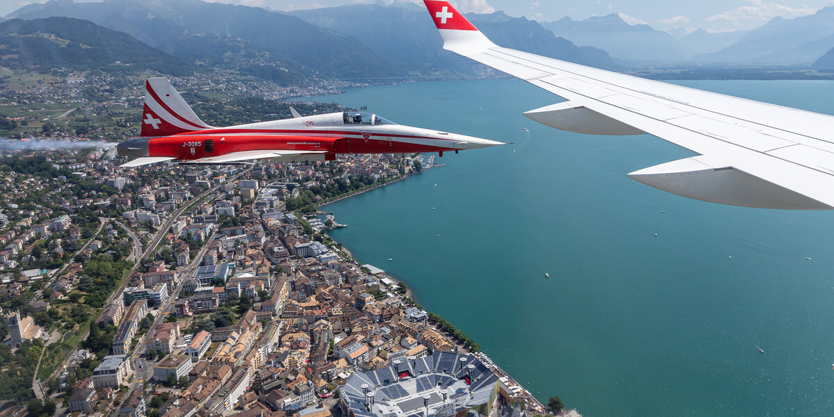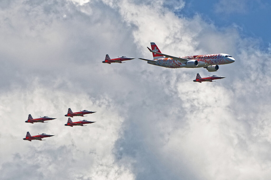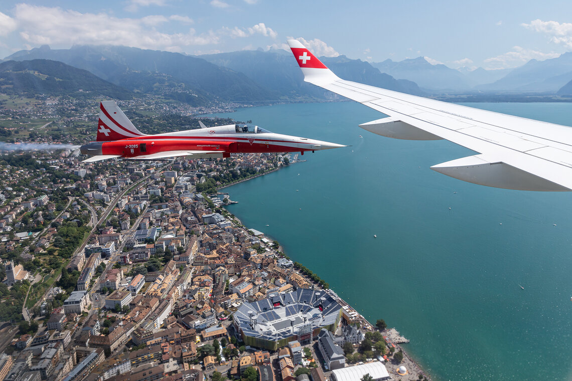 Die aus Richtung Châtel-St-Denis anfliegende CS300 von Swiss war akustisch kaum wahrnehmbar. Die vom Westschweizer Künstler Mathias Forbach alias Fichtre zu Ehren der Fête des Vignerons bemalte Maschine flog in geringer Höhe über den See. Im Schlepptau hatte sie die sechs F-5E Tiger der Patrouille Suisse. Die Kunstflugstaffel begeisterte mit ihrer Vorführung das Westschweizer Publikum und verabschiedete sich mit einem letzten gemeinsamen Vorbeiflug mit dem Airliner. Dieser zeigte sich nach der Separation noch einmal alleine über dem See, bevor er, genauso leise wie er gekommen war, über die Rebberge davonschwebte.