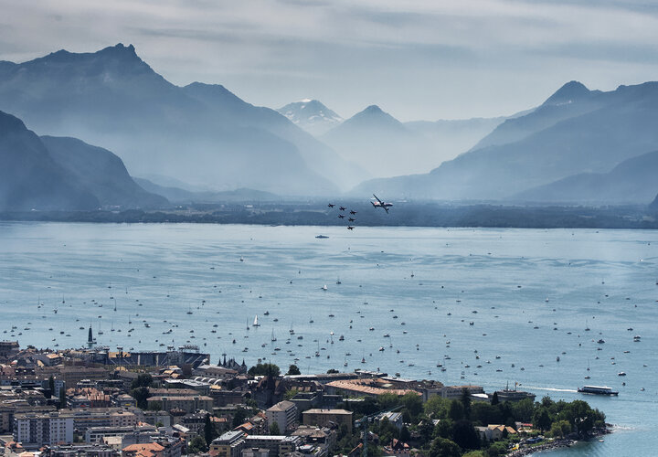 Punkt 12 Uhr wurde es laut in der Bucht von Vevey: Hauptmann Nicolas «Vincent» Rossier zog die F/A-18 punkt 12 Uhr hoch in den Himmel über dem Lac Léman. Tausende Zuschauer verfolgten die spektakulären Manöver des Kampfjets am Ufer oder in den Rebbergen am Mont Pèlerin.