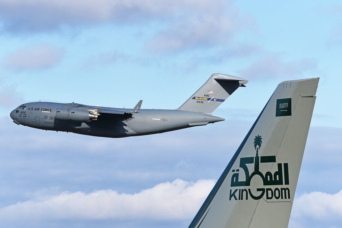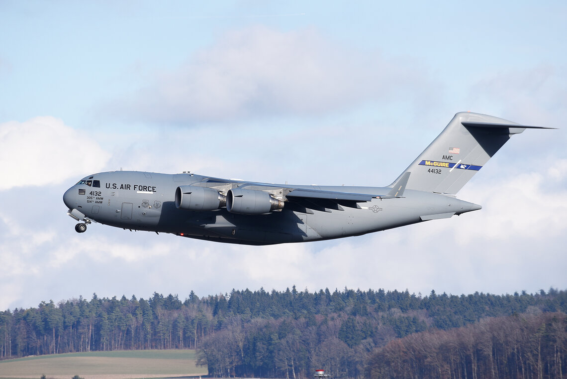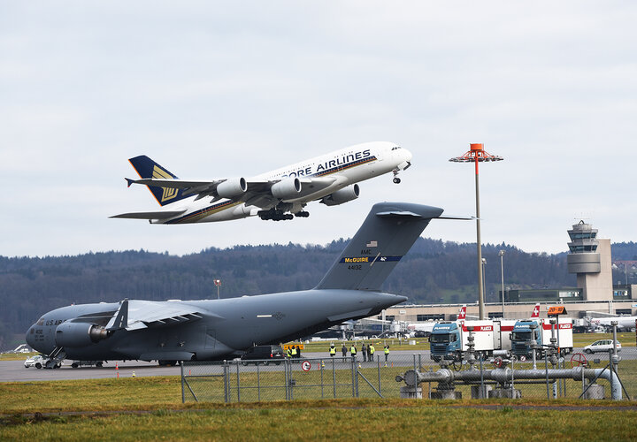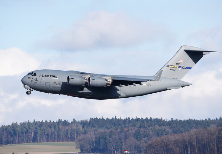 Am Samstagmorgen, 11. Januar, landete bereits das erste Militär-Transportflugzeug – eine Boeing C-17 Globemaster III – am Flughafen Zürich. Mit drei LKWs wurde das eingeflogene Material abgeholt. Anschliessend hob die gigantische Maschine gleich wieder ab. «Cockpit»-Mitarbeiter Simon Vogt hat das imposante Flugzeug fotografiert.