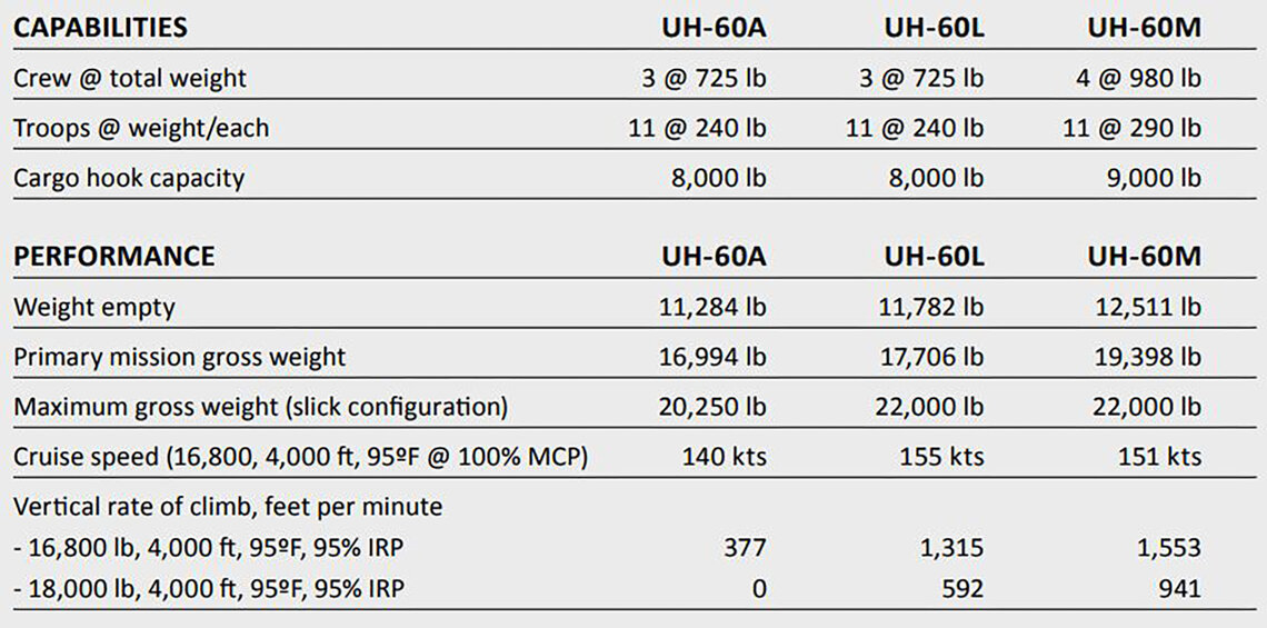 Der Black Hawk ist ein sehr zuverlässiger und aufgrund seiner Vielseitigkeit legendär gewordener Transporthelikopter. Seit seiner Lancierung 1974 wurde dieser Helikoptertyp vielfach verbessert und der technischen Weiterentwicklung angepasst. Neue Strukturen und Systeme verliehen dem UH-60 «Mike»-Modell mehr Auftrieb und Reichweite, verbesserte Flugeigenschaften, erhöhte Einsatzbereitschaft und ein integriertes Cockpit mit digitaler Konnektivität. Die Einsatzmöglichkeiten des Sikorsky UH-60M Black Hawk umfassen Lufttransport (Personal, Material), Patiententransport, Evakuierungen, Einsatz von Spezialeinsatzkräften, Absetzen von Fallschirmspringern sowie Brandbekämpfung aus der Luft. Der Black Hawk hat eine Reichweite von etwa 590 Kilometern, die sich mit aussen anbringbaren Zusatztanks bis auf rund 2200 Kilometer erweitern lässt. Er erreicht eine maximale Geschwindigkeit von 300 km/h und die maximale Flughöhe liegt bei rund 6000 Metern. Weitere Bestellungen für die Version «Mike» liegen aus Brasilien, Griechenland und Australien vor. Erster Auslandskunde war Bahrain.