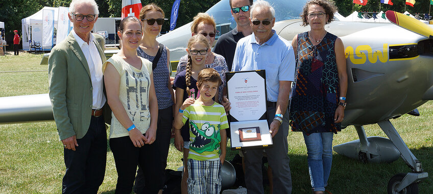 Anlässlich der Flugtage Fricktal-Schupfart wurde der Anerkennungspreis der Schweizer Stiftung Pro Aero für aussergewöhnliche Leistungen in der Luftfahrt an Max Vogelsang und seine Familie überreicht.
