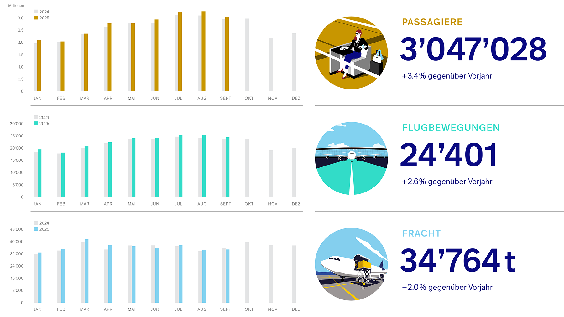 Airport Mehr Flugbewegungen und Passagiere, etwas weniger Fracht Das sind die Ergebnisse aus den Verkehrszahlen, die der Flughafen Zürich für den September 2025 erhoben hat. In diesem Monat sind…