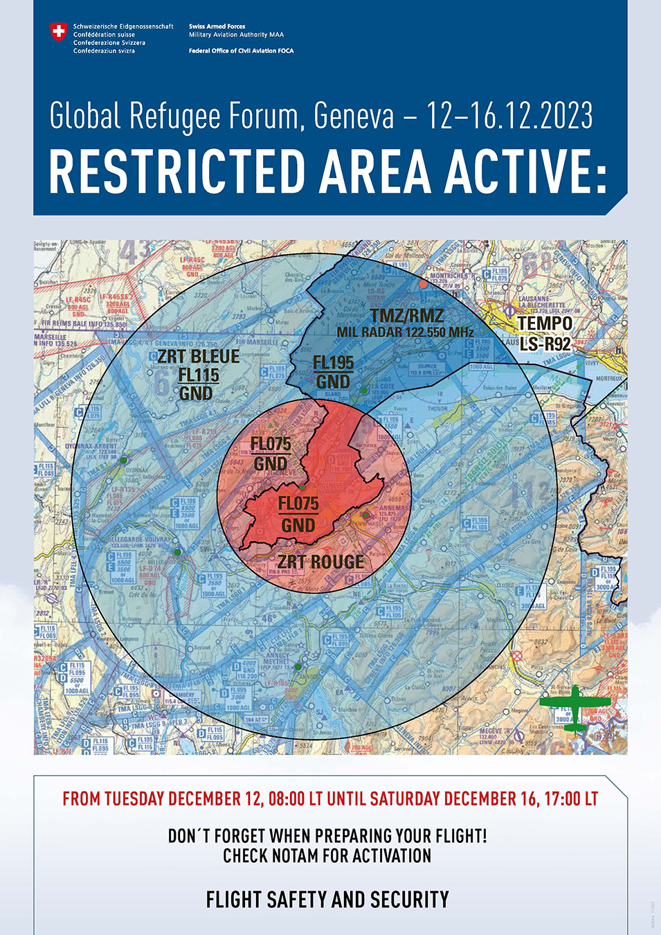 Military Aviation Luftraum Genf für Leichtaviatik vom 12. bis 16. Dezember 2023 gesperrt Vom 13. bis 15. findet in Genf das von der Schweiz und vom UNO-Hochkommissariat für Flüchtlinge organisierte Globale Flüchtlingsforum…