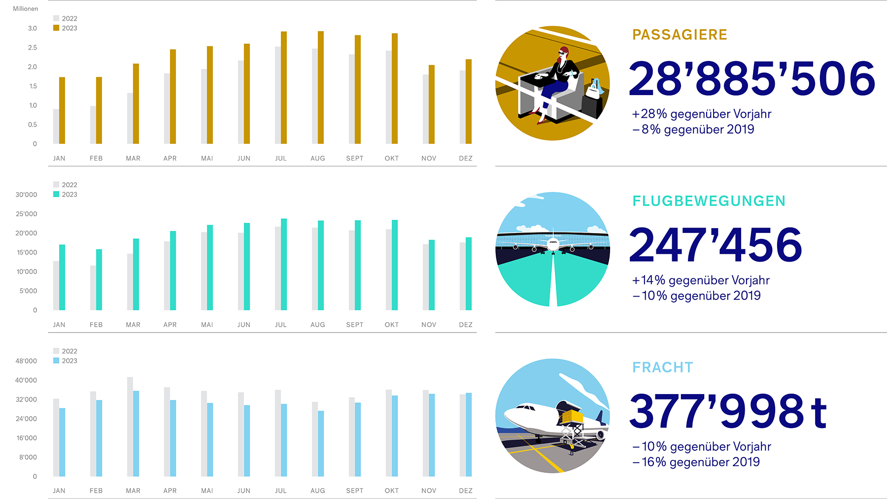Airport Flughafen Zürich: 28 Prozent mehr Fluggäste als vor einem Jahr Im Jahr 2023 sind 28.9 Millionen Passagiere über den Flughafen Zürich geflogen. Damit liegen die Passagierzahlen gegenüber 2019 bei…