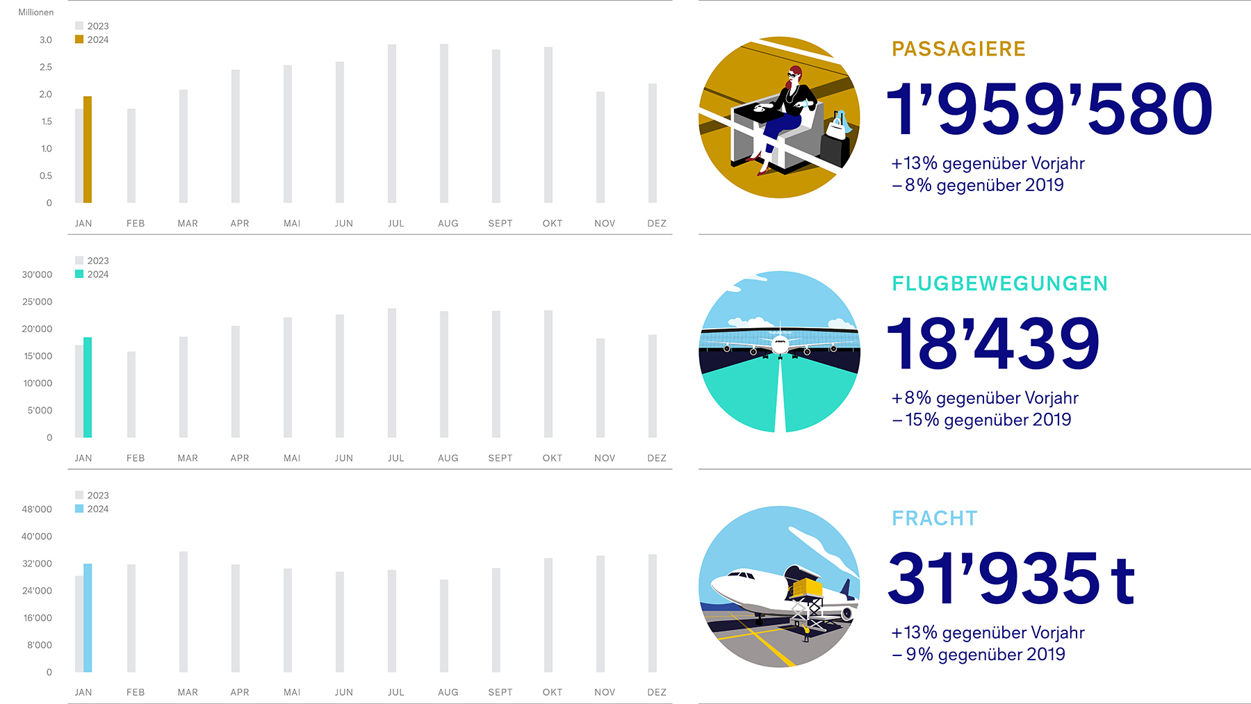 Airport Flughafen Zürich im Januar: 13 Prozent mehr Passagiere als im Vorjahresmonat Im Januar 2024 sind 1’959’580 Passagiere über den Flughafen Zürich geflogen. Das entspricht einem Plus von 13% gegenüber derselben…