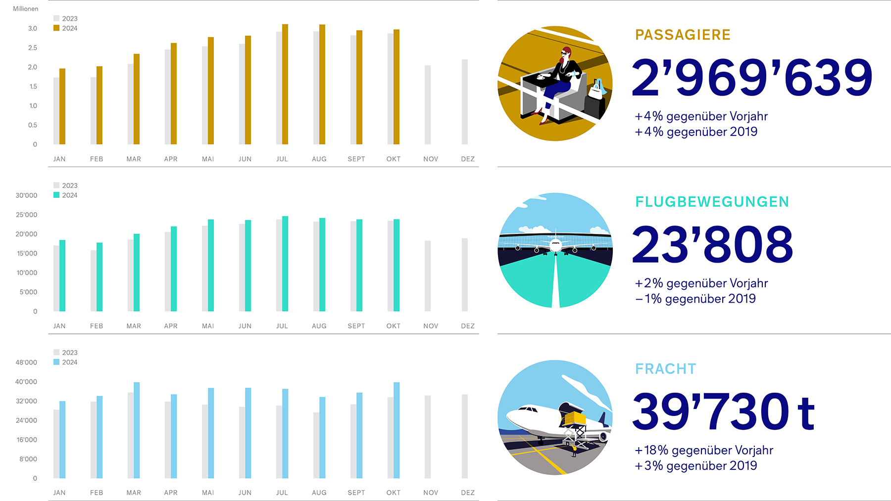 Airport ZRH: Weniger Flugbewegungen als 2019 bei mehr Passagieren Im Oktober 2024 sind 2’969’639 Passagiere über den Flughafen Zürich geflogen. Das entspricht einem Plus von 4% gegenüber derselben…